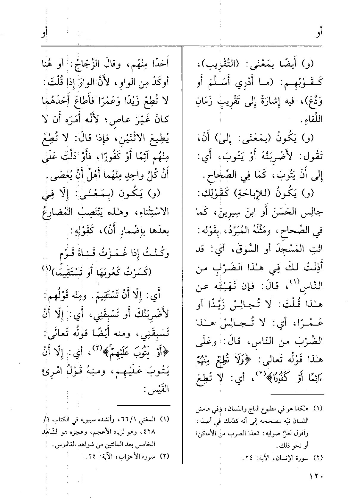 (كَسَرْتُ كُعُوبَها أَو تَسْتَقِيمَاأَي إلاَّ أَنْ تَسْتَقِيمَا. وَمِنْه قَوْلُهم: لأضْربنَّك أَو تَسْبقَني، أَي إلاَّ أَنْ تَسْبقَني؛ وَمِنْه أَيْضاً قَوْلُه تَعَالَى: {أَو يَتُوبَ عَلَيْهِم} ، أَي إلاَّ أَنْ يَتُوبَ عَلَيْهِم؛ وَمِنْهُم قَوْلُ امْرىءِ القَيْس: