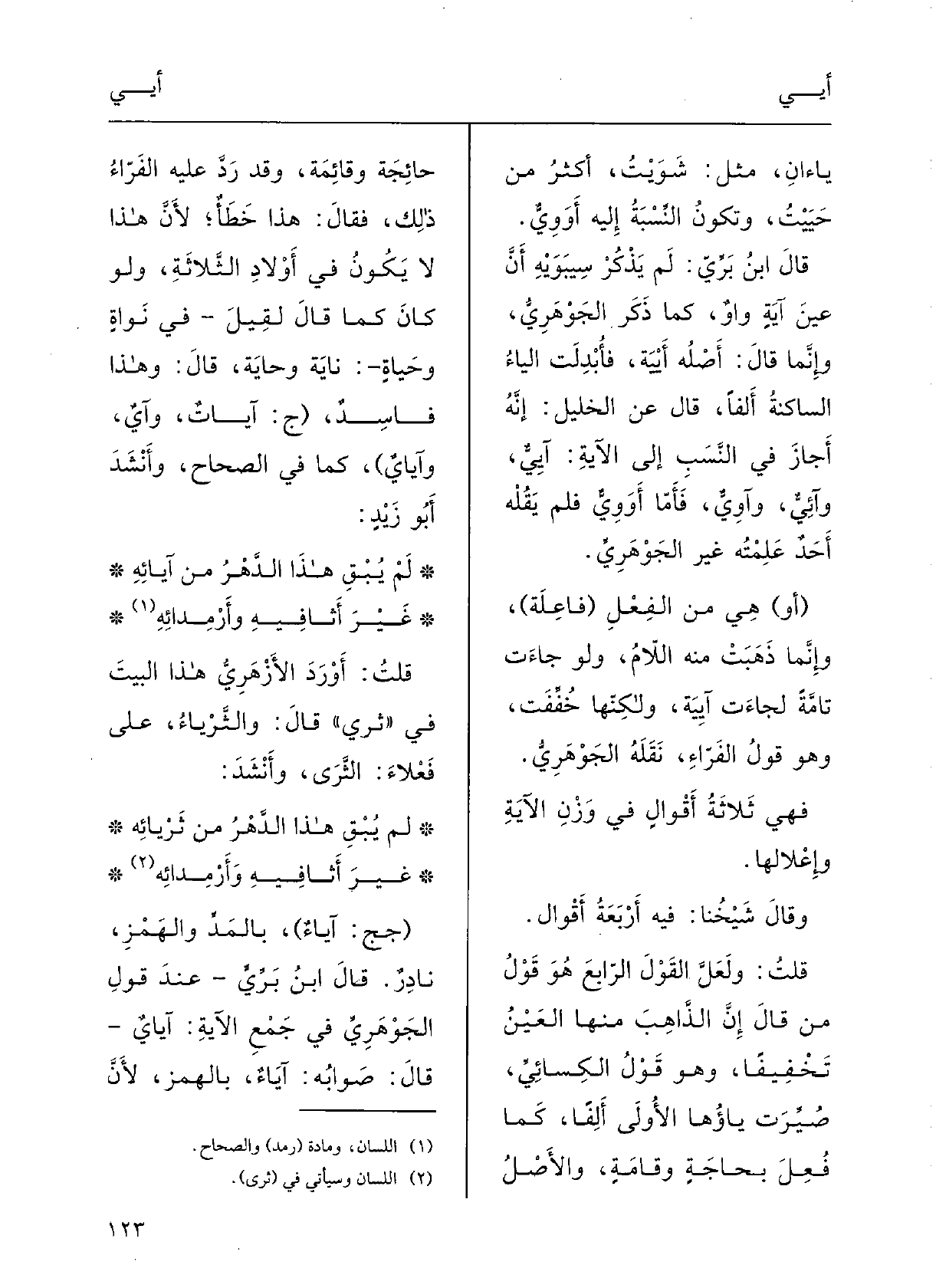 قالَ عَن الْخَلِيل: إنَّهُ أَجازَ فِي النّسَبِ إِلَى الآيَةِ {وآيِيٌّ} آئِيٌّ {وآوِيٌّ؛ فأمَّا أَوَوِيٌّ فَلم يَقُلْه أَحَدٌ عَلِمْته غَيْر الجَوْهرِيّ.