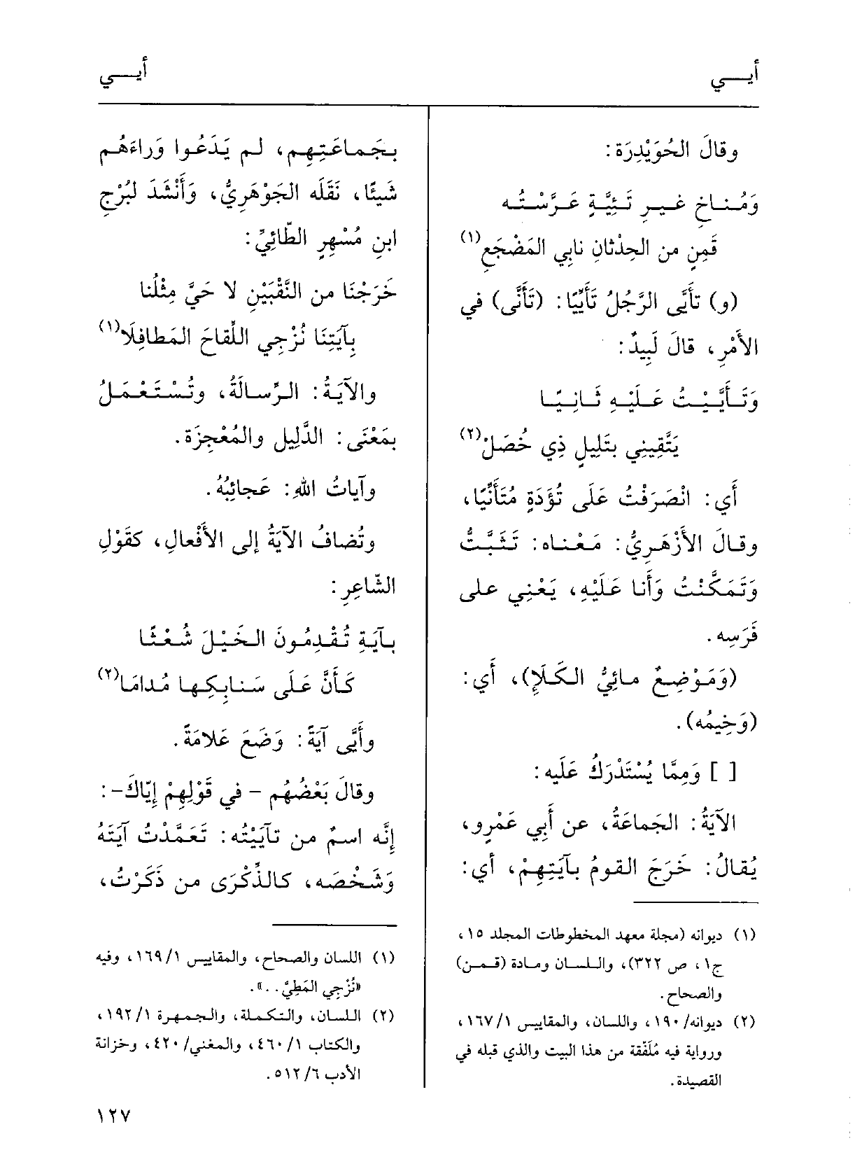 (خَرَجْنا من النَّقْبَيْن لَا حَيَّ مِثْلُنا {بآيتِنا نُزْجِي اللِّقاحَ المَطافِلا} والآيَةُ: الرِّسالَةُ، وتُسْتَعْملُ بمعْنَى الدَّليلِ والمُعْجِزَةِ.