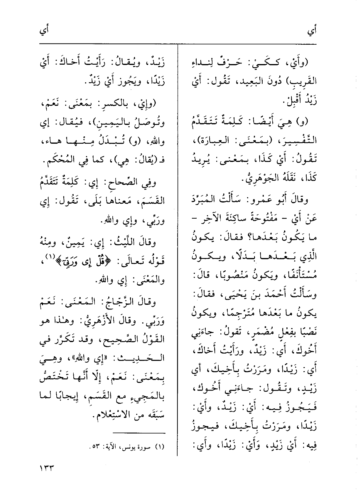 وقالَ أَبو عَمْروٍ: سَأَلْتُ المبرِّدَ عَن أَيْ مَفْتُوحَة ساكِنَة الآخرِ مَا يكونُ بَعْدَها فقالَ: يكونُ الَّذِي بَعْدها بَدَلاً، ويكونُ مُسْتأْنفاً، ويكونُ مَنْصوباً؛ قالَ: وسَأَلْتُ أَحمدَ بن يَحْيَى فقالَ: يكونُ مَا بَعْدَها مُتَرْجِماً، ويكونُ نصبا بفعْلٍ مُضْمَرٍ، تقولُ: جاءَني أَخُوكَ أَي زيدٌ، ورأَيْتُ أَخَاكَ أَي زيدا، ومَرَرْتُ بأَخِيكَ أَي زيدٍ، وتقولُ: جاءَني أَخُوكَ فيجوزُ فِيهِ أَي زيدٌ وأَي زيدا، ومَرَرْتُ بأَخِيكَ فيجوزُ فِيهِ أَي زيدٍ، أَي زيدا، أَي زيدٌ، ويقالُ: رأَيْتُ أَخَاك أَي زيدا، ويَجوزُ أَي زيدٌ.