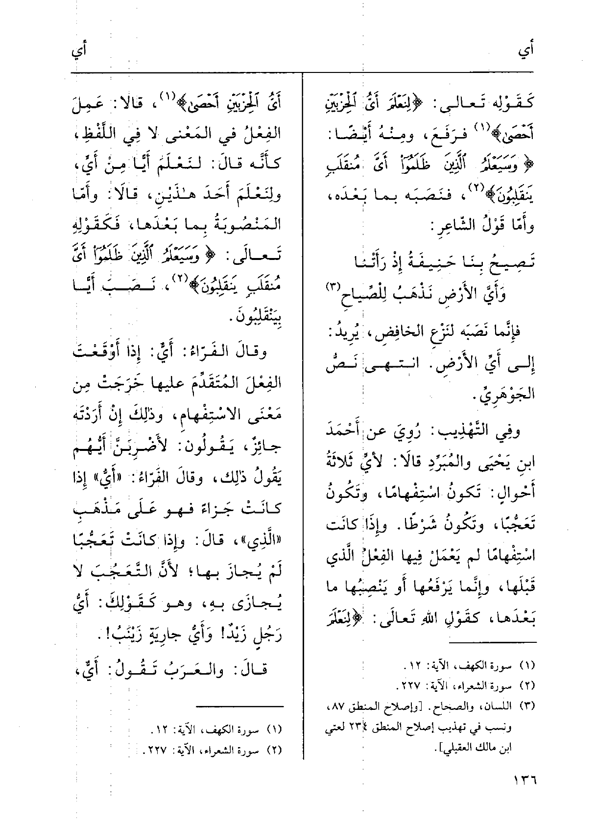 كقَوْلِه تَعَالَى: {لنَعْلَم أَيُّ الحِزْبَيْن أَحْصَى} ، فرَفَعَ، وَمِنْه أَيْضاً: {وسيَعْلَمُ الَّذين ظَلَمُوا أَيَّ مُنْقَلَبٍ يَنْقَلِبُونَ} فَنَصَبَه بِمَا بَعْدِه؛ وأَمَّا قَوْلُ الشاعِر: