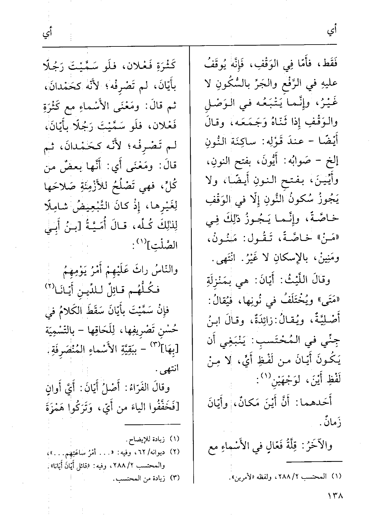 فَكُلُّهم قائلٌ للدينِ! أَيَّانا فَإِن سَمّيت بأَيَّان سَقَطَ الكَلامُ فِي حسنِ تَصْرِيفها للحاقِها بالتّسْمِيةِ ببَقِيَّةِ الأَسْماءِ المُتَصَرِّفَةِ، انتَهَى.