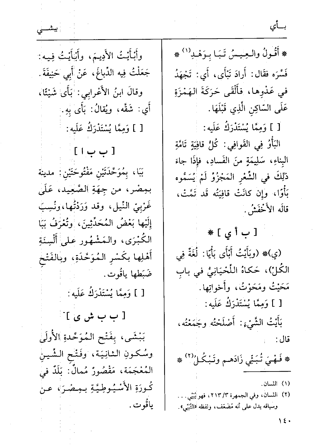وقالَ ابنُ الأَعرابيِّ:} بَأَى شَيْئا: أَي شَقَّه؛ ويقالُ: بَأَى بِهِ.