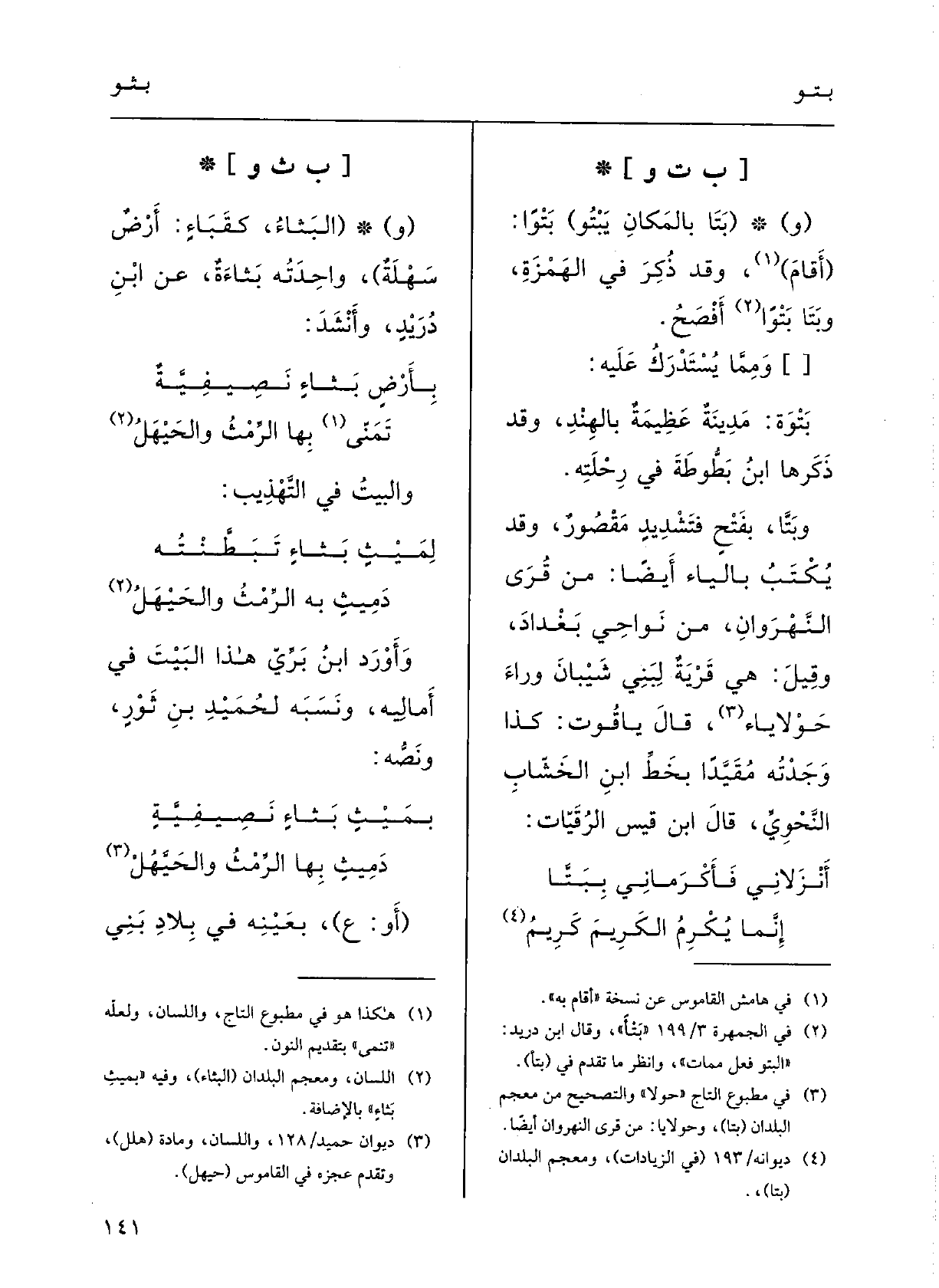 : (و ( {بَتا بالمَكانِ} يَبْتُو) {بَتْواً: (أَقامَ) ؛ وَقد ذُكِرَ فِي الهَمْزةِ.} وبَتا بَتْواً أَفْصَحَ.