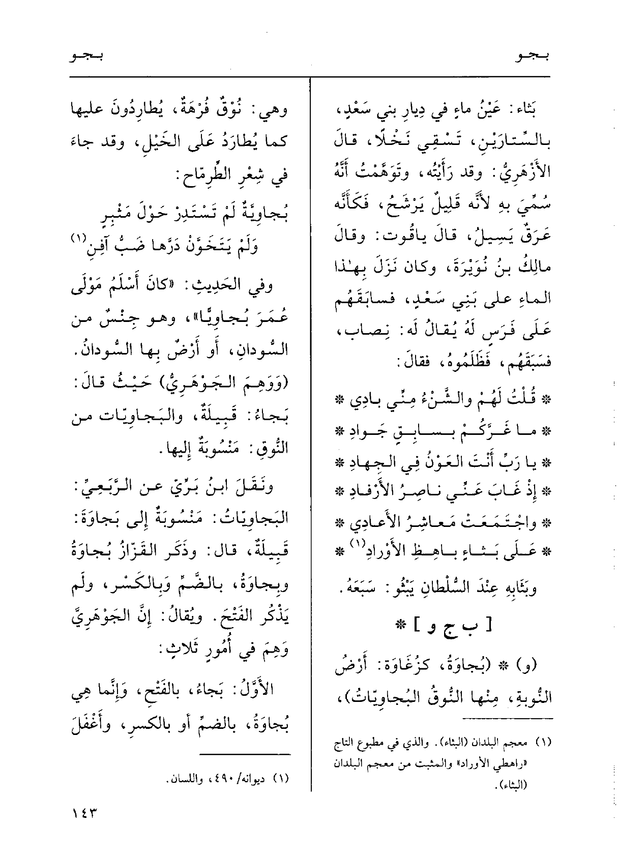 ويقالُ: إنَّ الجَوْهرِيَّ وَهِمَ فِي أُمُورٍ ثلاثٍ: الأَوَّل: بَجاءُ بالفَتْحِ، وإنَّما هِيَ بِجُاوَةُ، بالضمِّ أَو بالكسْرِ.