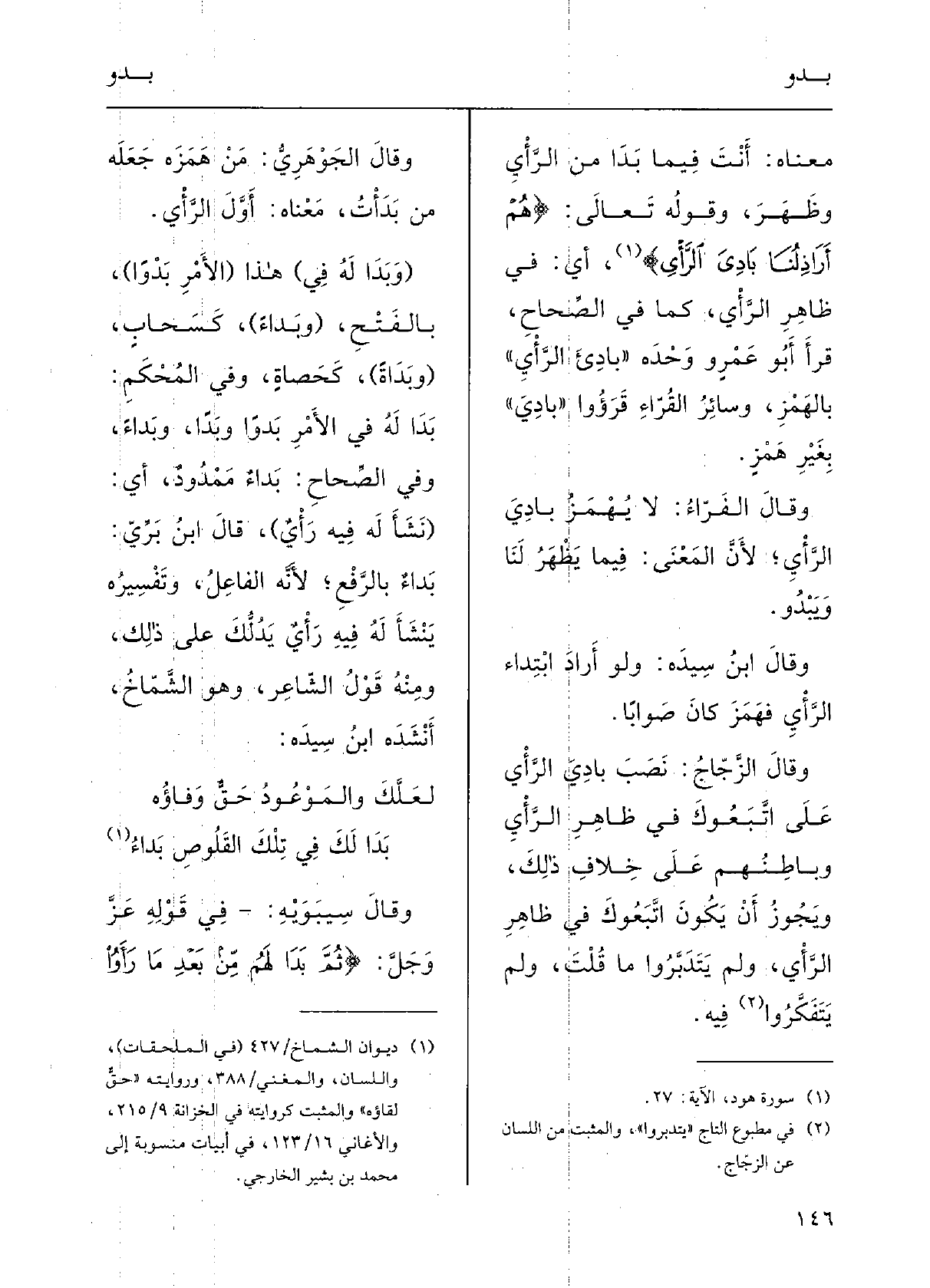 قالَ ابنُ بَرِّي: بَداءٌ، بالرَّفْعِ، لأنَّه الفاعِلُ وتَفْسِيره بنَشَأَ لَهُ فِيهِ رَأْيٌ يدلّك على ذلِكَ؛ وَمِنْه قَوْلُ الشاعِرِ، وَهُوَ الشَّماخُ، أَنْشَدَه ابنُ سِيدَه: