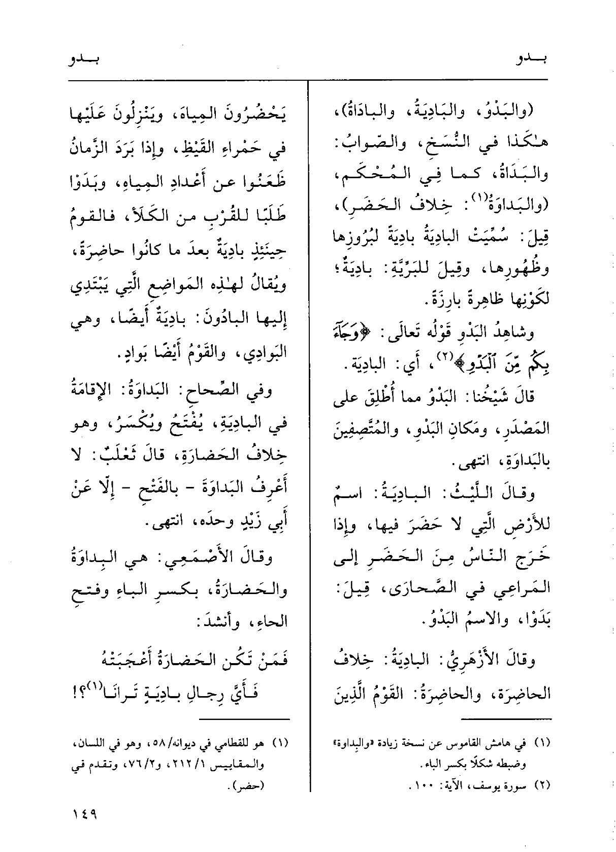 وقالَ الأَزْهرِيُّ: البادِيَةُ خِلافُ الحاضِرَةِ، والحاضِرَةُ القوْمُ الذينَ يَحْضُرونَ المِياهَ ويَنْزلونَ عَلَيْهَا فِي حَمْراءِ القَيْظِ، فَإِذا بَرَدَ الزَّمانُ ظَعَنُوا عَن أَعْدادِ المِياهِ وبَدَوْا طَلَباً للقُرْبِ مِن الكَلإِ، فالقَوْم حينَئِذٍ بادِيَةٌ بَعْدَ مَا كَانُوا حاضِرَةً. ويقالُ لهَذِهِ المَواضِع الَّتِي يَبْتَدِي إِلَيْهَا} البادُونَ بادِيَةٌ أَيْضاً، وَهِي {البَوادِي، والقَوْم أَيْضاً} بَوادٍ.