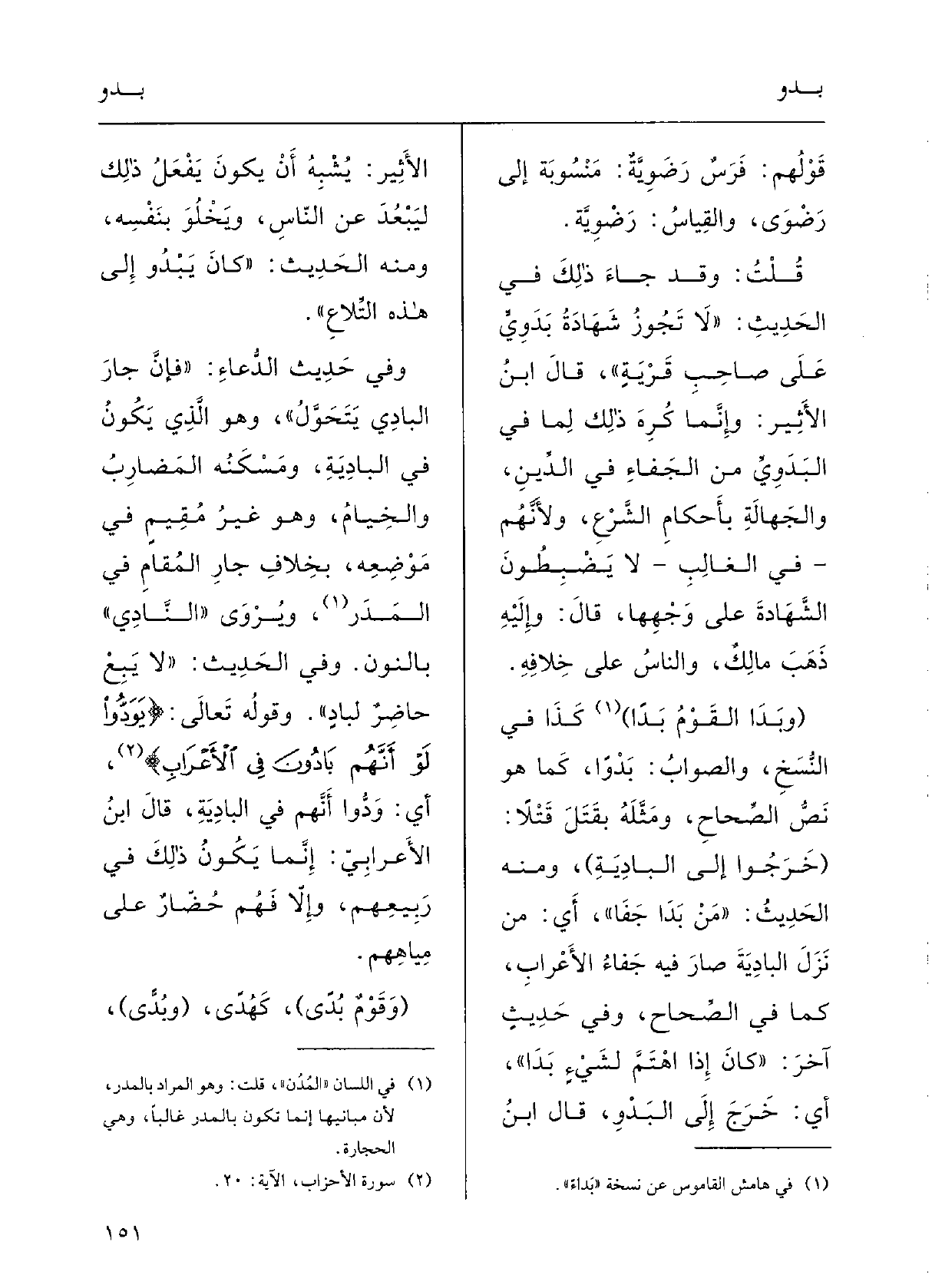قالَ ابنُ الأثيرِ: يُشْبِهُ أَنْ يكونَ يَفْعَل ذلِكَ ليَبْعُدَ عَن الناسِ ويَخْلُو بنَفْسِه؛ وَمِنْه الحدِيثُ: (كَانَ {يَبْدُو إِلَى هَذِه التِّلاعِ) .
