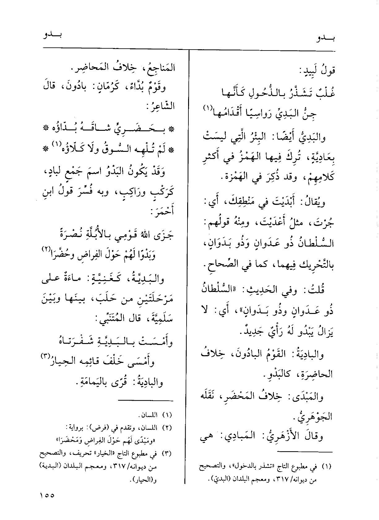 لم تُلْهِهِ السُّوقُ وَلَا كلاؤُهوقد يكونُ البَدْوُ اسمَ جَمْعٍ} لبادٍ كركْبٍ ورَاكِبٍ؛ وَبِه فُسِّرَ قَوْلُ ابنِ أَحْمر: