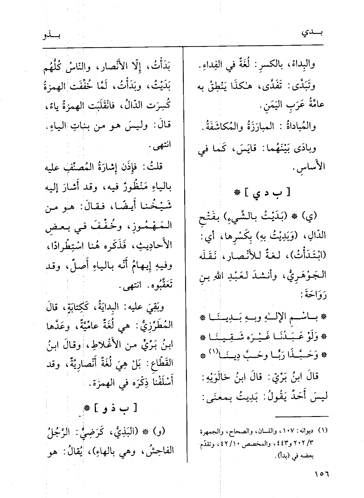 وَلَو عَبَدْنا غيرَه شَقِينا وحَبَّذا رَبّاً وحُبَّ دِينا قالَ ابنُ بَرِّي: قالَ ابنُ خَالَوَيْه: ليسَ أَحَدٌ يقولُ} بَدِيتُ بمعْنَى: بَدَأْتُ إلاَّ الأنْصار، والناسُ كُلَّهم بَدَيْتُ وبَدَأْتُ، لمَّا خُفّفَتِ الهَمْزَةُ كُسِرَتِ الدالُ فانْقَلَبَتِ الهَمْزَةُ يَاء، قالَ: وليسَ هُوَ من بناتِ الياءِ، انتَهَى.
