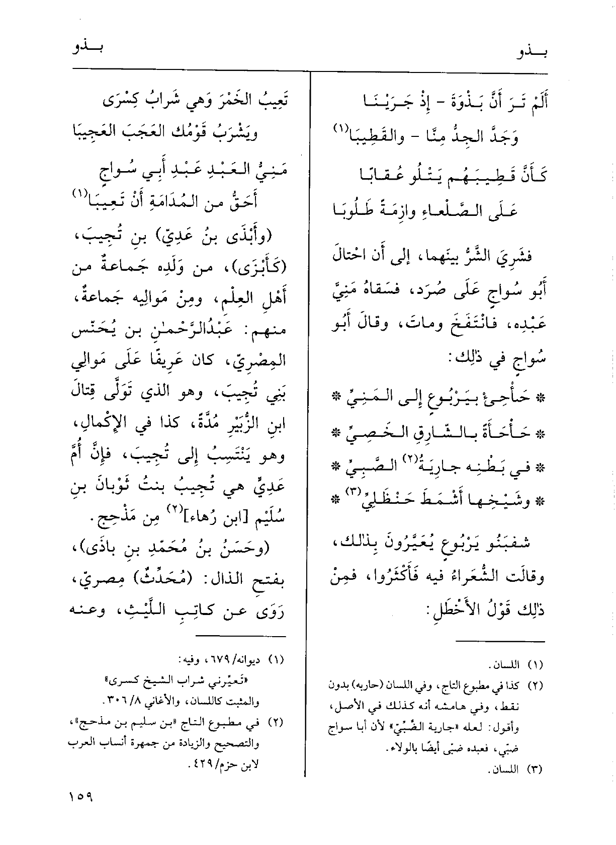 أَحَقُّ من المُدامَةِ أَن تَعِيبا ( {وأَبْذَى بنُ عَدِيِّ) بنِ تجيبٍ، (كأَبْزَى) مِن ولدِهِ جماعَةٌ مِن أَهْلِ العِلْمِ، ومِن مَوالِيه جماعَةٌ مِنْهُم: عبدُالرحمانِ بنُ يحنس المِصْريُّ كانَ عريفاً على مَوالي بَني تجيبٍ، وَهُوَ الَّذِي تَولَّى قِتالَ ابنِ الزُّبَيْر مُدَّةً؛ كَذَا فِي الإكْمالِ. وَهُوَ يَنْتسبُ إِلَى تَجيبٍ، فإنَّ أُمَّ عَدِيَ هِيَ تجيبُ بنْتُ ثَوْبان بنِ سليم بنِ مَذْحَجٍ.
