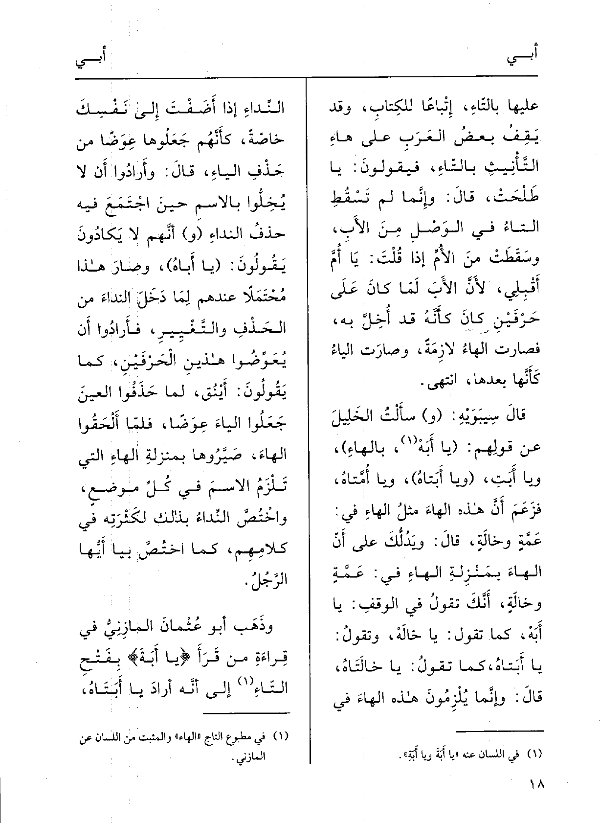 قالَ سيْبَوَيْه: (وسَأَلْتُ الْخَليلَ عَن قَوْلِهم: (يَا {أَبَهْ، بالهاءِ وَيَا} أَبَتِ (وَيَا {أَبَتاهُ وَيَا أُمَّتاهُ، فزَعَمَ أنَّ هَذِه الهاءَ مثْلُ الهاءِ فِي عَمَّه وخَالَه، قَالَ: ويدلُّكَ على أَنَّ الهاءَ بمنْزِلَةِ الهاءِ فِي عَمَّه وخالَه أنَّك تقولُ فِي الوَقْفِ يَا أَبَهْ، كَمَا تقولُ يَا خالَهْ، وتقولُ يَا أَبَتاهْ كَمَا تقولُ يَا خالتَاهُ، قالَ: وإنّما يلزمون هَذِه الهاءَ فِي النِّداءِ إِذا أَضَفْتَ إِلَى نَفْسِك خَاصَّة، كَأَنَّهَا جَعَلُوها عِوَضاً من حذْفِ الياءِ، قَالَ: وأَرادُوا أَنْ يُخِلُّوا بالاسْمِ حينَ اجْتَمَعَ فِيهِ حَذْف النِّداء، (وأنَّهم لَا يَكادُونَ يقُولُونَ: (يَا} أَباهُ، وصَارَ هَذَا مُحْتَملاً عنْدَهم لِمَا دَخَلَ النِّداءَ مِن الحَذْفِ والتَّغْييرِ، فأَرَادُوا أَن يُعَوِّضوا هذَيْن الحَرْفَيْن كَمَا يَقولُونَ أَيْنُق، لمَّا حَذَفُوا العَيْن جَعَلوا الياءَ عِوَضاً، فلمَّا أَلْحَقُوا الهاءَ صَّيرُوها بمنْزِلَةِ الهاءِ الَّتِي (تلْزم) الاسْمَ فِي كلِّ مَوْضِع، واخْتَصّ النِّداء بذلِكَ لكَثْرتِه فِي كَلامِهم كَمَا اخْتصَّ بيا أَيُّها الرَّجُل.