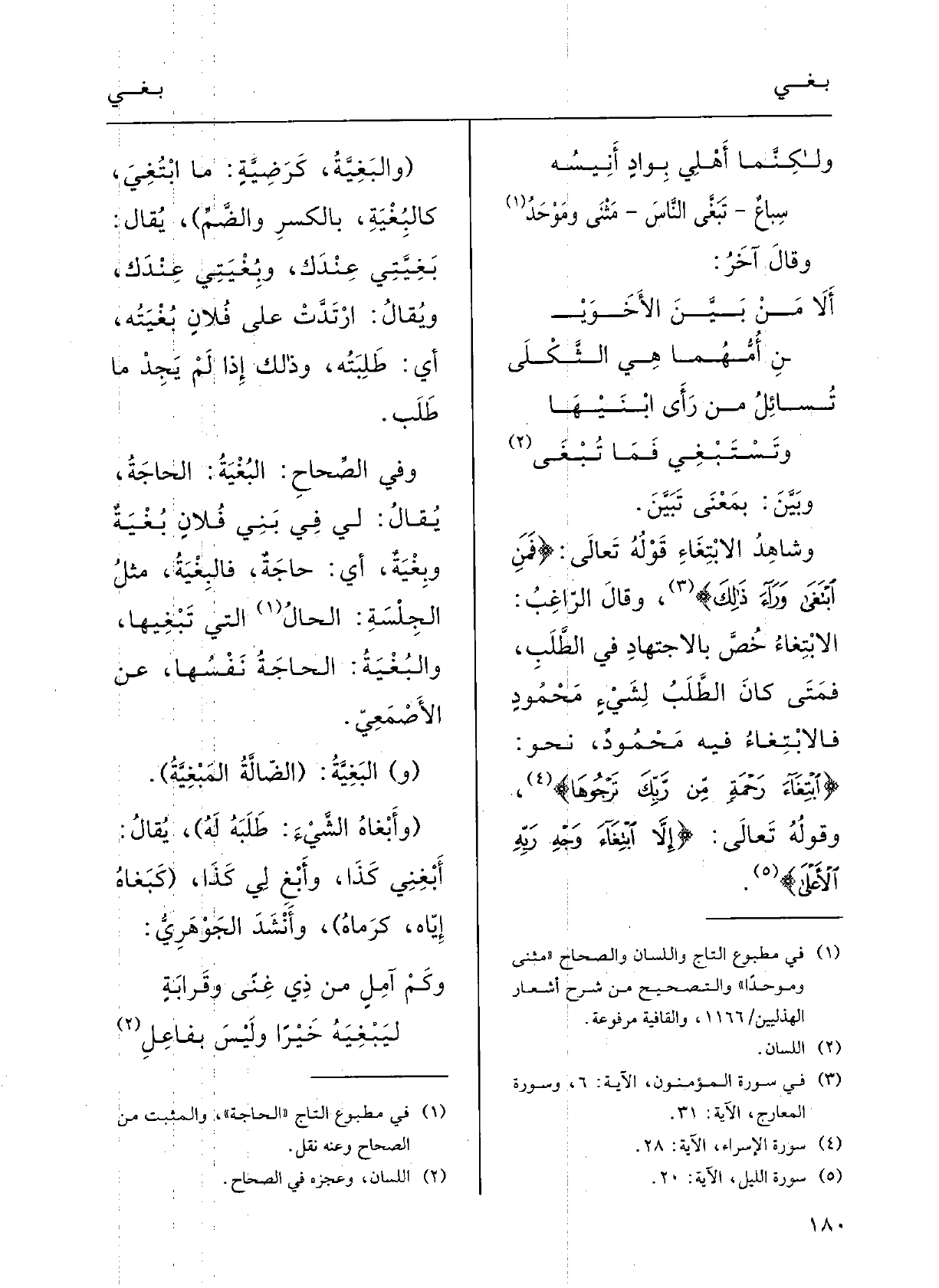 وَفِي الصِّحاحِ:} البُغْيَةُ: الحاجَةُ. يقالُ: لي فِي بَني فلانٍ {بَغْيَةٌ} وبُغْيَةٌ، أَي حاجَةٌ، {فالبِغْيَةُ مثْل الجِلْسَةِ الحاجَةُ الَّتِي} تَبْغِيها {والبُغْيَةُ الحاجَةُ نَفْسُها؛ عَن الأَصْمعيّ.