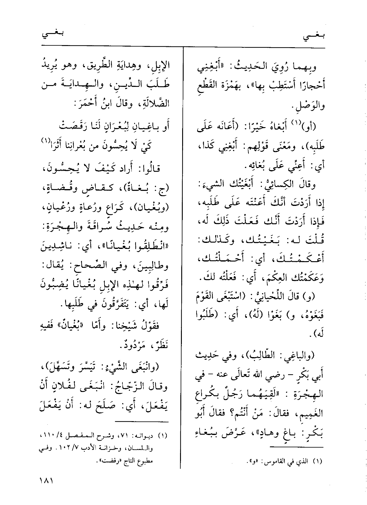 وَفِي حِدِيثِ أَبي بكْرٍ، رَضِيَ اللَّهُ تَعَالَى عَنهُ، فِي الهِجْرةِ: (لقِيهما رجُلٌ بكُراعِ الغَمِيمِ فقالَ: مَنْ أَنْتم؟ فقالَ أَبو بكْرَ: {باغٍ وهادٍ) ؛ عَرَّضَ} بِبُغاءِ الإِبِلِ وهِدَايَة الطَّريقِ، وَهُوَ يُريدُ طلبَ الدِّينِ والهِدايَةِ من الضّلالَةَ؛ وقالَ ابنُ أَحْمر: