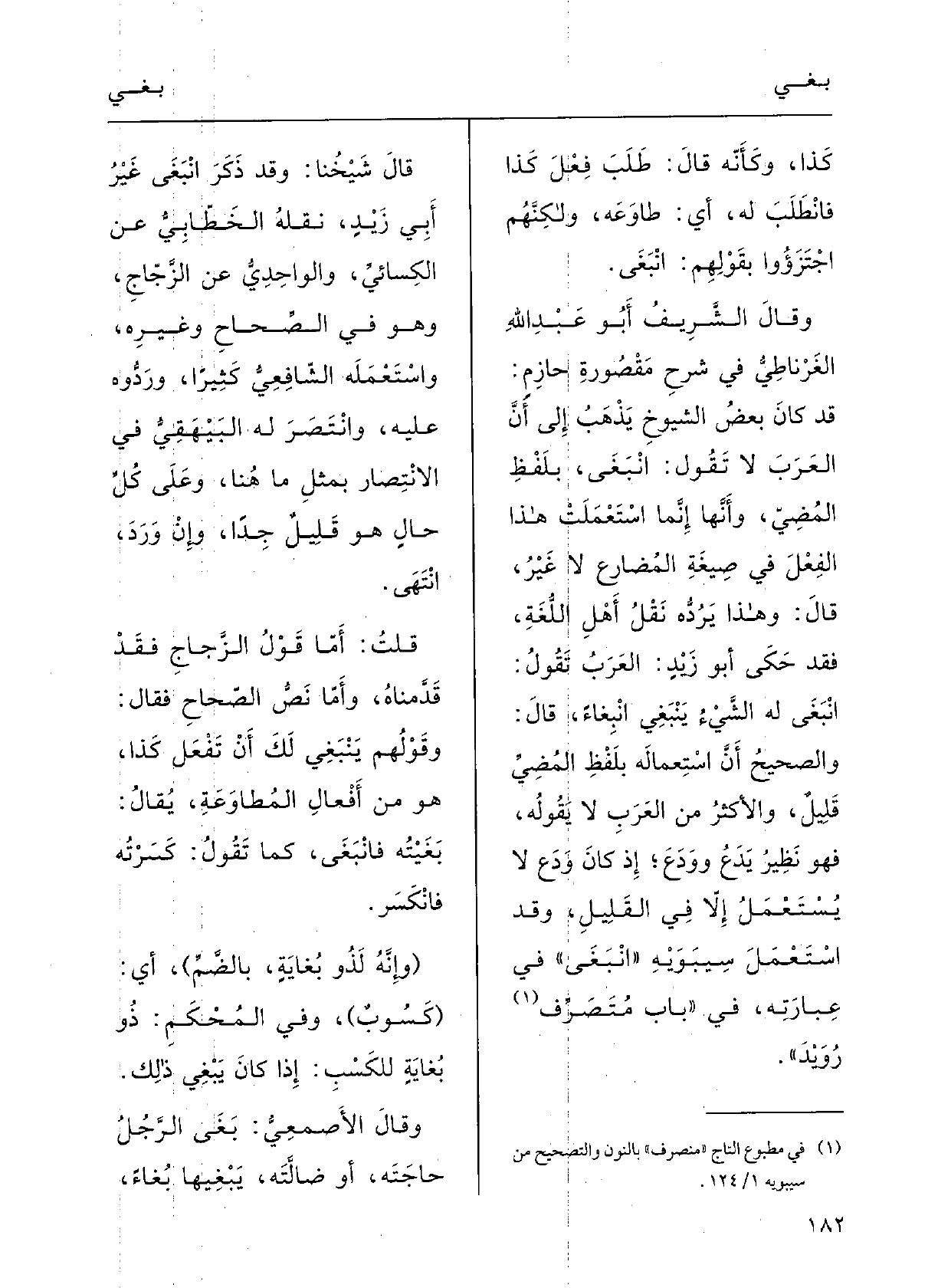 وقالَ الشَّريفُ أَبو عبدِ اللَّهِ الغرْناطيُّ فِي شرْحِ مَقْصُورَةِ حَازِم: قد كانَ بعضُ الشُّيُوخ يَذْهَبُ إِلَى أنَّ العَرَبَ لَا تقولُ انْبَغَى بلَفْظِ الْمَاضِي، وأنَّها إنَّما اسْتَعْمَلَتْ هَذَا الفَعْلَ فِي صيغَةِ المُضارِعِ لَا غَيْر، قالَ: وَهَذَا يردّه نَقْل أَهْل اللغَةِ؛ فقد حَكَى أَبو زيْدٍ: العَرَبُ تقولُ: انْبَغَى لَهُ الشَّيْء {يَنْبَغي} انْبِغاءً، قالَ: والصَّحيحُ أنَّ اسْتَعْمالَه بلَفْظِ الْمَاضِي قَليلٌ، والأَكْثَر مِن العَرَبِ لَا يَقُوله، فَهُوَ نظِيرُ يدعِ وودع إِذْ كَانَ ودع لَا يُسْتَعْمل إلاّ فِي القَليلِ، وَقد اسْتَعْمَل سِيْبَوَيْه انْبَغَى فِي عِبارَتِه فِي بابِ منصرف رويد. قالَ شيْخُنا: وَقد ذَكَرَ انْبَغَى غير أبي زيدٍ نَقَلَهُ الخطابيُّ عَنْ الْكسَائي والواحدِيُّ عَن الزجَّاجِ وَهُوَ فِي الصِّحاحِ وَغَيره واسْتَعَمْلَهُ الشَّافِعِي كثيرا وردُّوه عَلَيْهِ وانتصر لَهُ البَيْهَقيّ فِي الانْتِصارِ بمثْلِ مَا هُنَا؛ وعَلى كلِّ حالٍ هُوَ قَليلٌ جدّاً وَإِن وَرَد، انتَهَى.