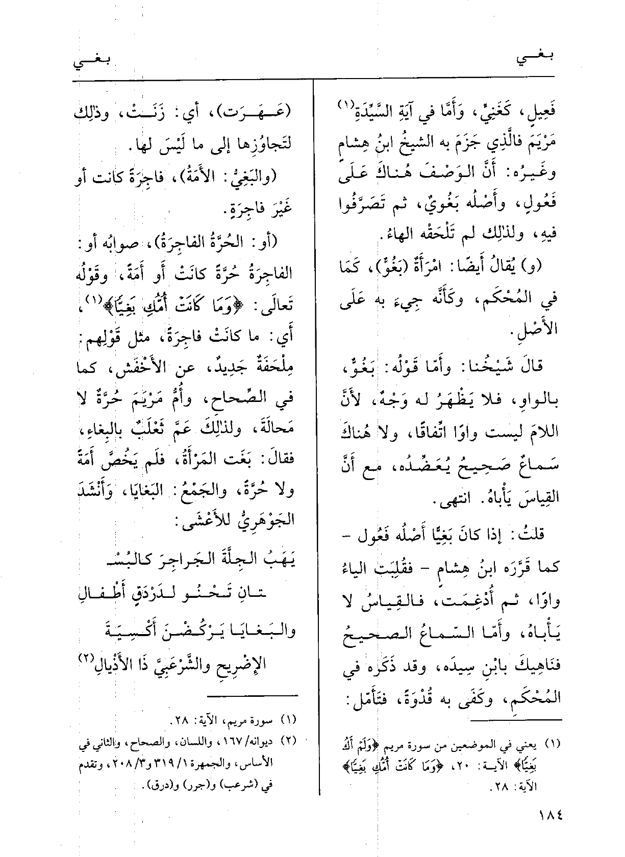 وقَوْلُه تَعَالَى: {وَمَا كانتْ أُمُّكِ بغِيّاً} ؛ أَي مَا كانتْ فاجِرَةً، مثْلُ قَوْلِهم مِلْحَفَة جَدِيدٌ؛ عَن الأخْفَش، كَمَا فِي الصِّحاحِ؛ وأُمُّ مَرْيَم حُرَّةٌ لَا مَحَالَةَ. ولذاك عَمَّ ثعلبٌ بالبِغاءِ فقالَ: {بَغَتِ المرأَةُ، فَلم يَخُصَّ أَمَةٌ وَلَا حُرَّةً، والجَمْعُ} البَغايَا؛ وأَنْشَدَ الجوْهرِيُّ للأَعْشى: