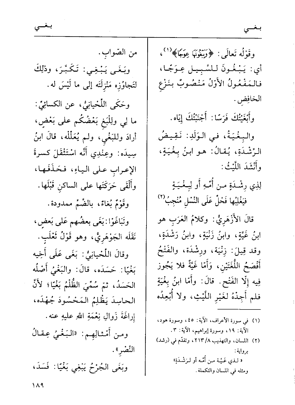 قالَ: وأَمَّا ابنُ بِغْيَةٍ فَلم أَجِدْه لغَيْرِ اللّيْثِ وَلَا أُبْعِدُه مِن الصَّوابِ.