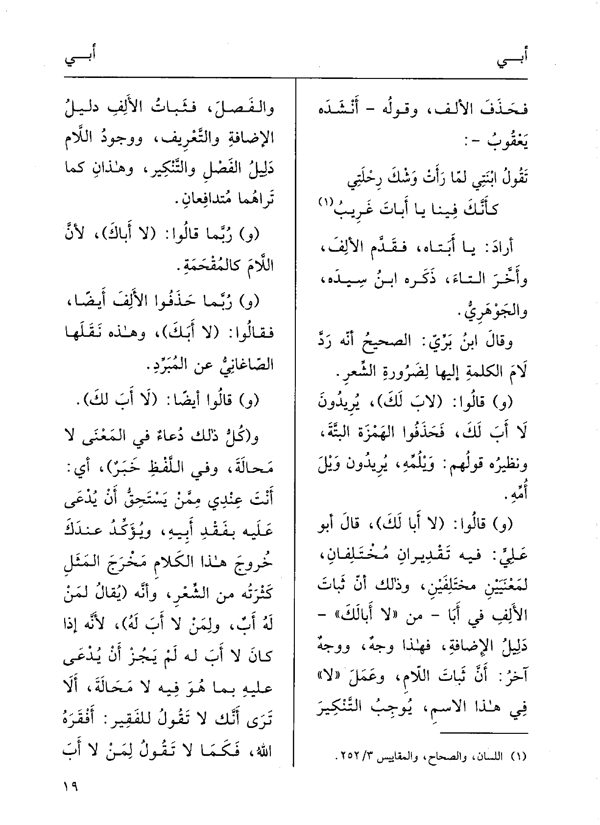 (وَقَالُوا أَيْضاً: (لَا أَبَ لَكَ؛ و (كُلُّ ذلِكَ دُعاءٌ فِي المَعْنَى لَا مَحالةَ، وَفِي اللَّفْظِ خَبَرٌ، أَي أَنتَ عنْدِي ممَّنْ تستحقُّ أَن يُدْعى عَلَيْهِ بفقْدِ! أَبيهِ. ويُؤَكّد عنْدك خُروجُ هَذَا الكَلام مَخْرَج المَثَل كُثْرتُه فِي الشِّعْرِ، وأنَّه (يقالُ لمن لَهُ أَبٌ وَلمن لَا أَبَ لَهُ، لأنَّه إِذا كانَ لَا أَبَ لَهُ لم يَجُزْ أَن يُدْعَى عَلَيْهِ بِمَا هُوَ فِيهِ لَا مَحالَةَ، أَلا تَرى أنَّك لَا تقولُ للفَقِيرِ أَفْقَرَه الله، فَكَمَا لَا تقولُ لمَنْ لَا أَبَ