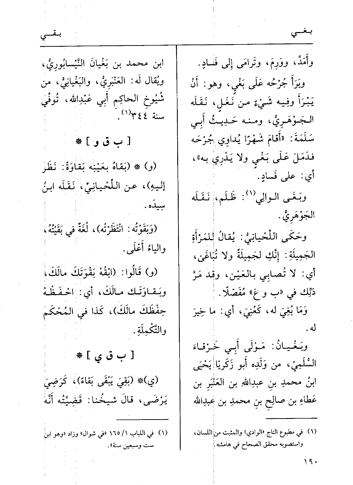 وحَكَى اللَّحْيانيُّ: يقالُ للمَرْأَةِ الجَمِيلةِ: إنَّك لجميلَةٌ وَلَا {- تُباغَيْ، أَي لَا تُصَابي بالعَيْن؛ وَقد مَرَّ ذلِكَ فِي بوغ مُفْصّلاً.