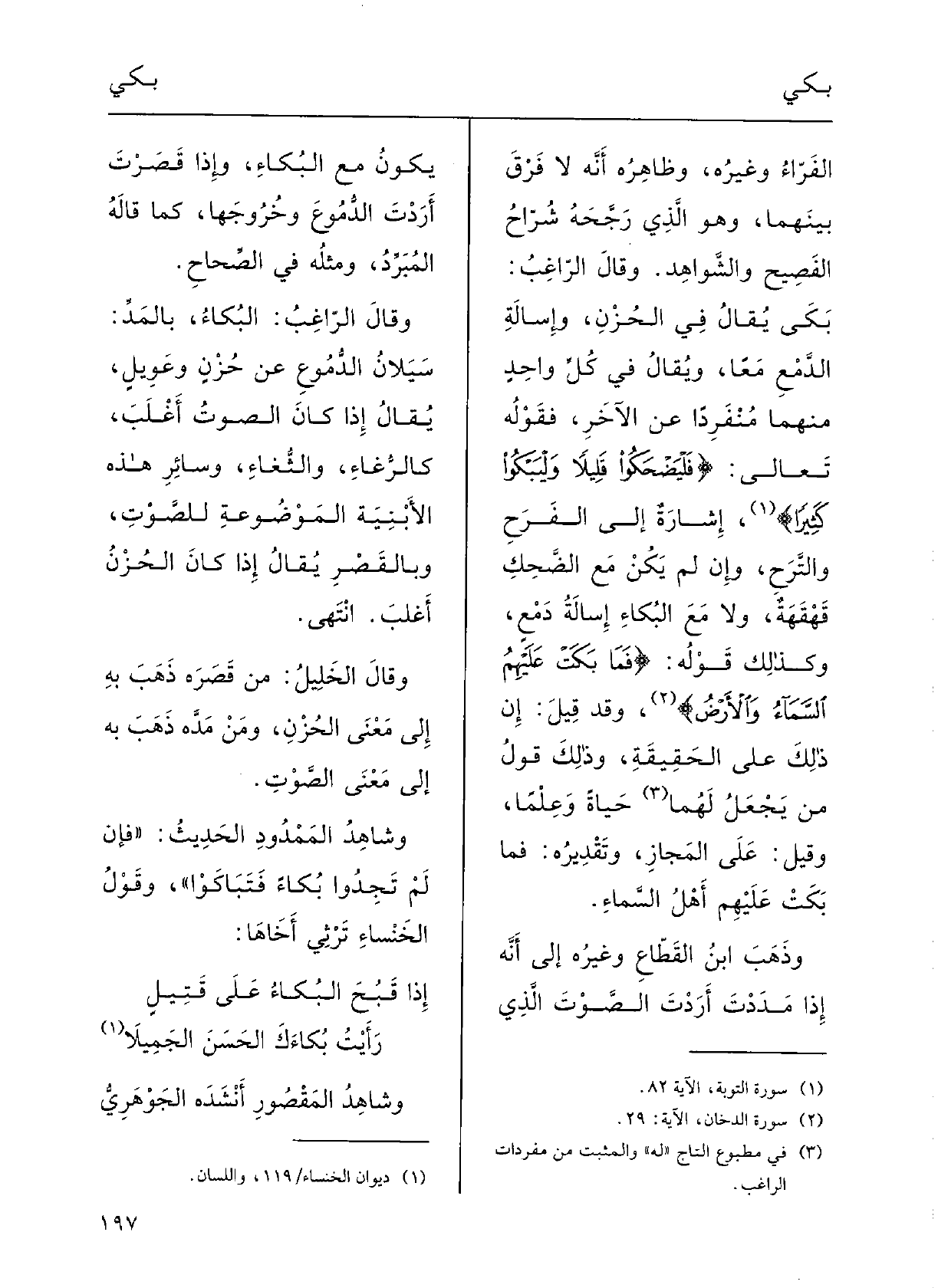 وقالَ الرَّاغبُ: بُكىً يُقالُ فِي الحُزْنِ وإسالَةِ الدَّمْع مَعاً، ويُقالُ فِي كلِّ واحِدٍ مِنْهُمَا مُنْفرداً عَن الآخرِ؛ فقَوْلُه تَعَالَى: {فليَضْحَكُوا قَلِيلاً {وليَبْكُوا كَثيراً} إشارَة إِلَى الفَرَحِ والتَّرَحِ وإنْ لم يكنْ مَعَ الضحكِ قَهْقَهَه وَلَا مَعَ} البُكاءِ إسالَة دَمْعٍ؛ وكَذلِكَ قَوْله: {فَمَا {بَكَتْ عَلَيْهِم السَّماءُ والأرضُ} ؛ وَقد قيل: إنَّ ذلِكَ على الحَقيقَةِ وَذَلِكَ قَوْل مَنْ يَجْعَل لَهُ حَيَاة وعِلْماً، وقيلَ على المجازِ وتَقْديرُه: فَمَا بَكَتْ عَلَيْهِم أَهْلُ السّماءِ.