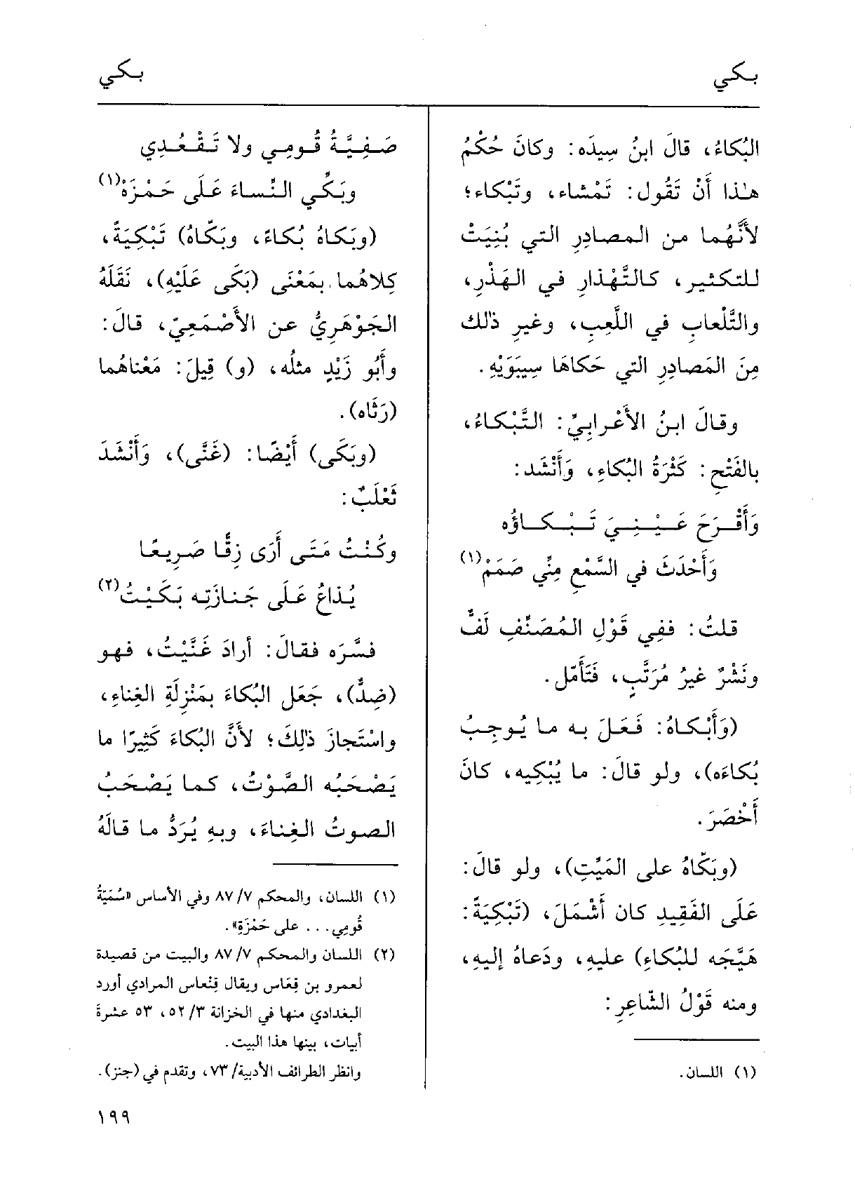 يُذاعُ على جَنازَتِه! بَكَيْتُ فَسَّره فقالَ: أَرادَ غَنَّيْتُ، فَهُوَ (ضِدٌّ) ، جَعَلَ البُكاءَ بمنْزِلَةِ الغِناء، واسْتَجازَ ذلِكَ لأنَّ البُكاءَ كَثيراً مَا يَصْحبُه الصَّوْت كَمَا يَصْحَبُ الصَّوْت الغِناء. وَبِه يُرَدُّ مَا قالَهُ