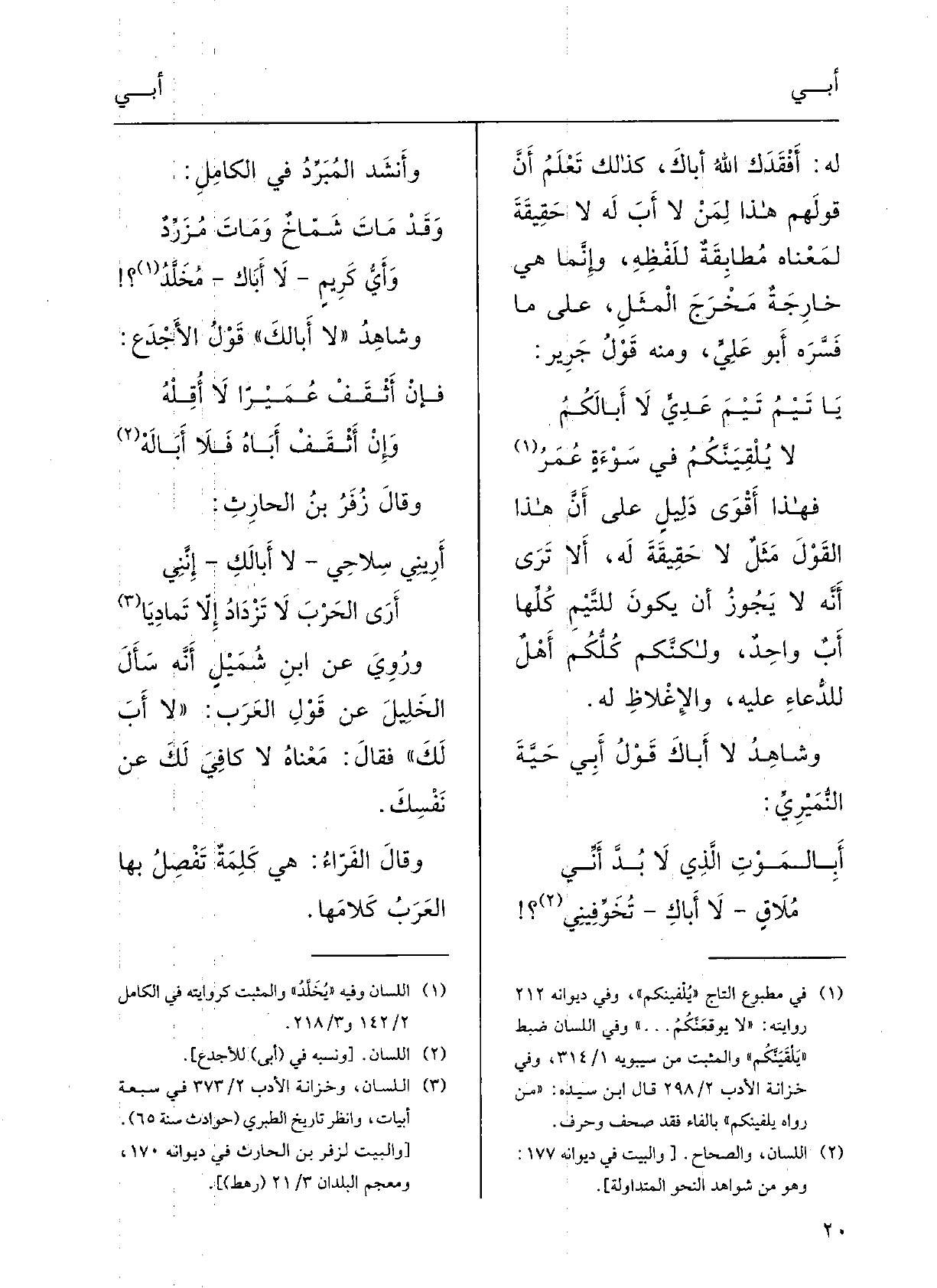 أَرِيني سِلاحِي لَا أَبَالَكِ إنَّنيأَرَى الحَرْب لَا تَزْدادُ إلاَّ تَمادِياورُوِيَ عَن ابنِ شُمَيْل: أنَّه سَأَلَ الخَليل عَن قَوْلِ العَرَبِ لَا أَبَ لَكَ، فقالَ: مَعْناه لَا كافيَ لَكَ عَن نَفْسِك.