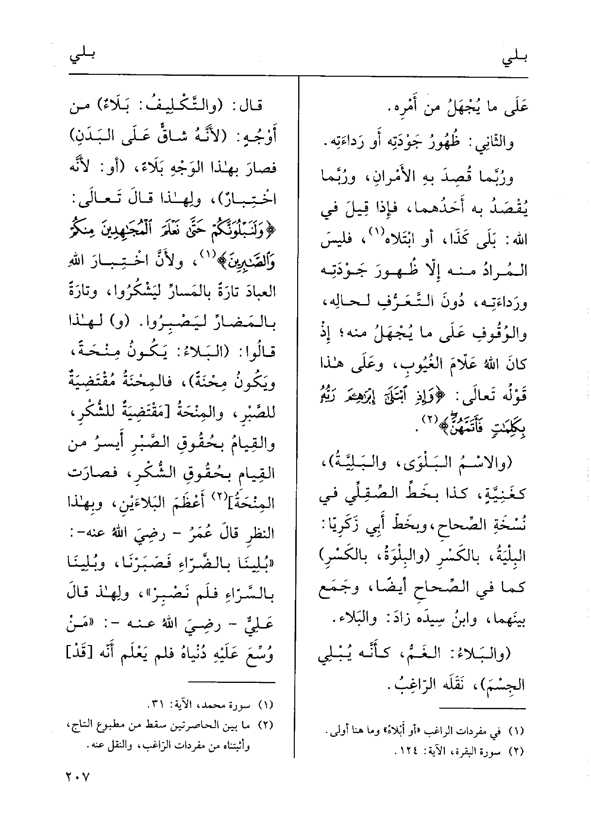 على مَا يُجْهَلُ مِن أَمْرِه؛ وَالثَّانِي: ظهورُ جودَتِه ورَداءَتِه، ورُبَّما قُصِدَ بِهِ الأَمْران، ورُبَّما يُقْصَدُ بِهِ أَحَدُهما، فَإِذا قيلَ فِي الله {بَلَى كَذَا أَو} ابْتَلاه، فليسَ المُراد مِنْهُ إلاَّ ظُهُور جودَتِه ورَداءَته دونَ التَّعرُّفِ لحالِهِ والوُقُوفِ على مَا يجهَلُ مِنْهُ، إِذْ كانَ اللَّهُ علاَّمَ الغُيوبِ، وعَلى هَذَا قَوْلُه تَعَالَى: {وَإِذا {ابْتَلَى إِبْرَاهِيم ربه بكلماتٍ فأَتَمَّهُنَّ} .