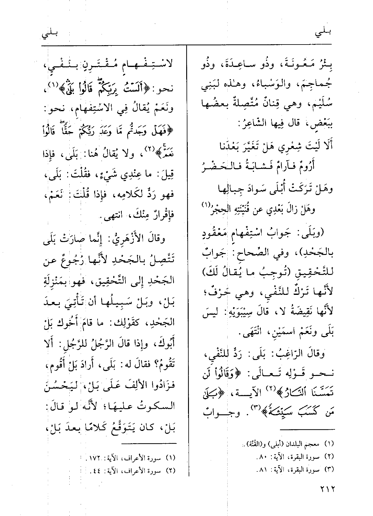 وقالَ الرَّاغبُ: بَلَى رَدٌّ للنَّفْي، نَحْو قَوْله تَعَالَى: {وَقَالُوا لن تَمسَّنا النَّار} ، الآيَةُ، {بَلَى مِن كسب سَيِّئَة} ؛ وجوابٌ لاسْتِفْهامٍ مُقْتَرنٍ بنَفْيٍ نَحْو: {أَلَسْتُ برَبِّكم؟ قَالُوا: بَلَى} ؛ ونَعَم يقالُ فِي الاسْتِفْهامِ نَحْو {هَل وَجَدْتُم مَا وَعَد رَبّكم حَقّاً؟ قَالُوا: نَعَم} ، وَلَا يُقالُ هُنَا بَلَى، فَإِذا قيلَ: مَا عنْدِي شيءٌ، فقُلْتُ بَلَى، فَهُوَ رَدُّ لكَلامِه، فَإِذا قُلْت نَعَم فإقْرارٌ منْكَ، انْتَهَى.