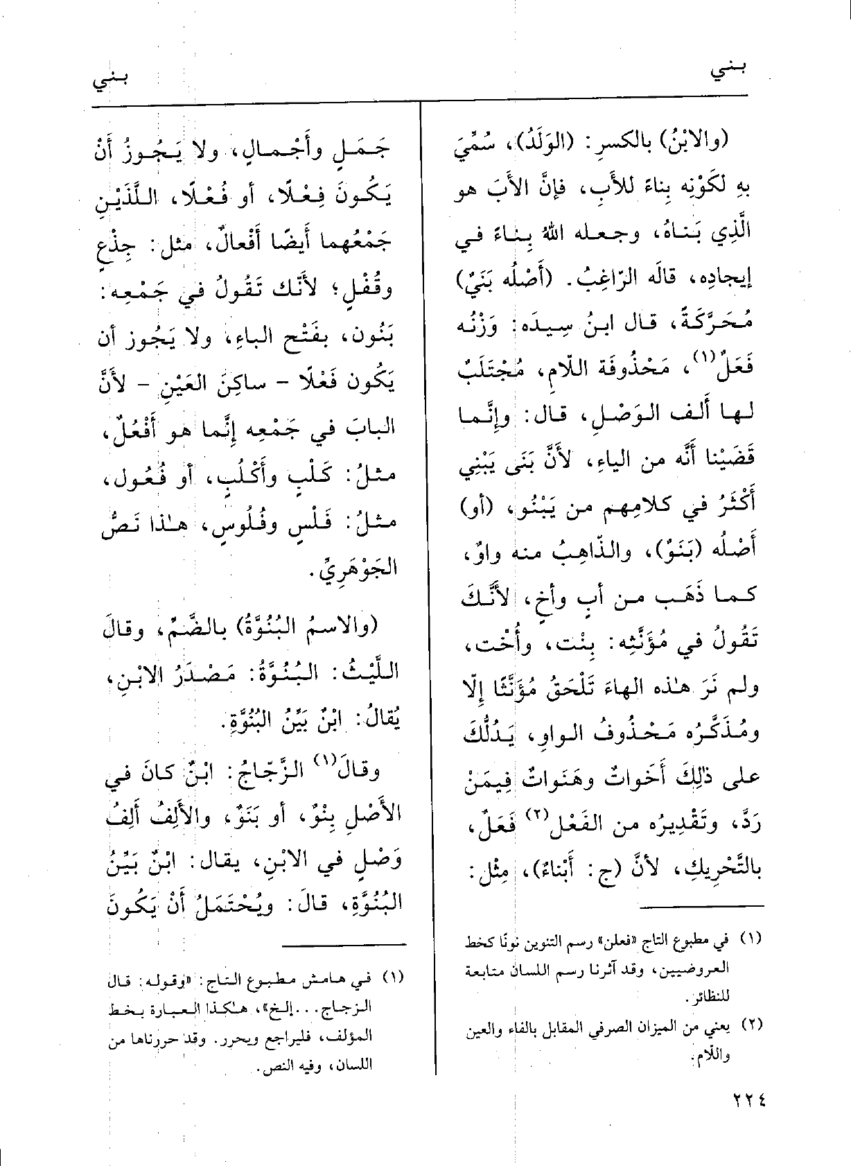وقالَ اللّيْثُ: البُنُوَّةُ مَصْدَرُ الابنِ. يقالُ:} ابنٌ بَيِّنُ {البُنُوَّةِ.