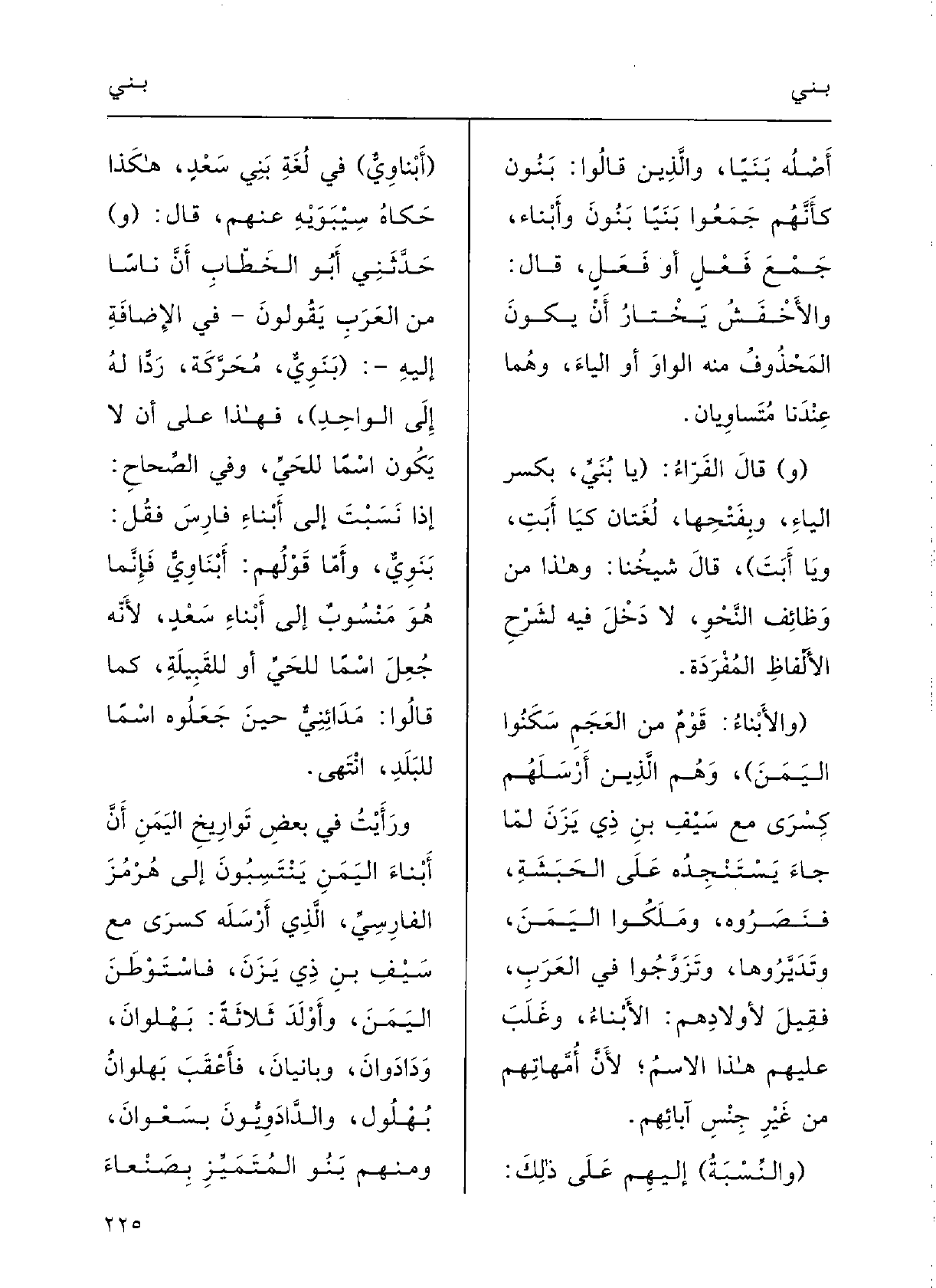 قالَ: (و) حدَّثَني أَبو الخطَّاب أَنَّ نَاسا مِن العَرَبِ يقُولُونَ فِي الإضَافَةِ إِلَيْهِ ( {بَنَوِيٌّ، محرَّكةً، رَدّاً لَهُ إِلَى الواحِدِ) ، فَهَذَا على أَنْ لَا يكون اسْماً للحيِّ.