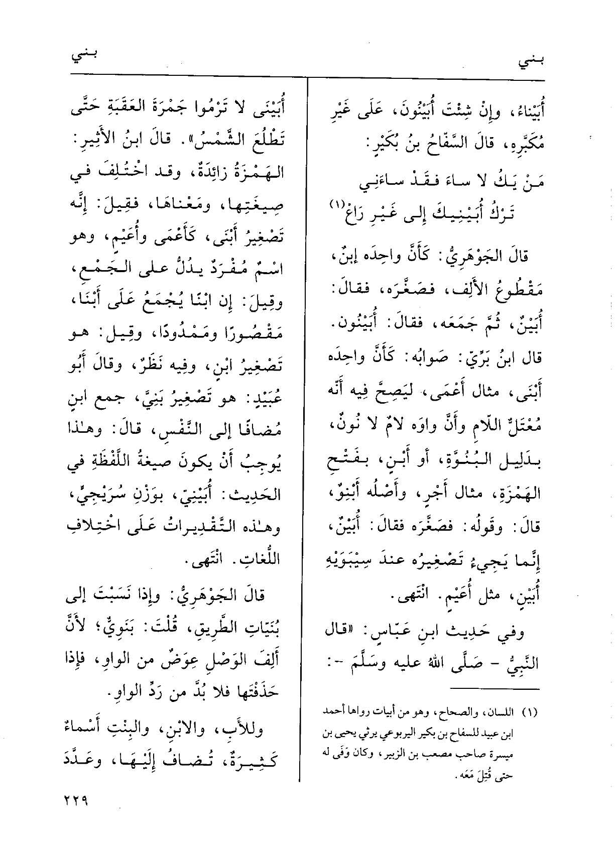 قالَ ابنُ بَرِّي: صَوابُه كأنَّ واحِدَه} أَبْنى مثْالُ أَعْمى ليصحَّ فِيهِ أَنَّه مُعْتل اللامِ، وأنَّ واوَه لامٌ لَا نونٌ بدَلِيلِ البُنُوَّة، أَو {أَبْنٍ بفتْحِ الهَمْزةِ مثَالُ أَجْرٍ، وأَصْله أَبْنِوٌ، قالَ: وقَوْله فصَغَّره فقالَ} أُبَيْنٌ إنَّما يَجِيءُ تَصْغيرُه عنْدَ سِيْبَوَيْه أُبَيْنٍ مِثل أُعَيْمٍ، انْتَهَى.