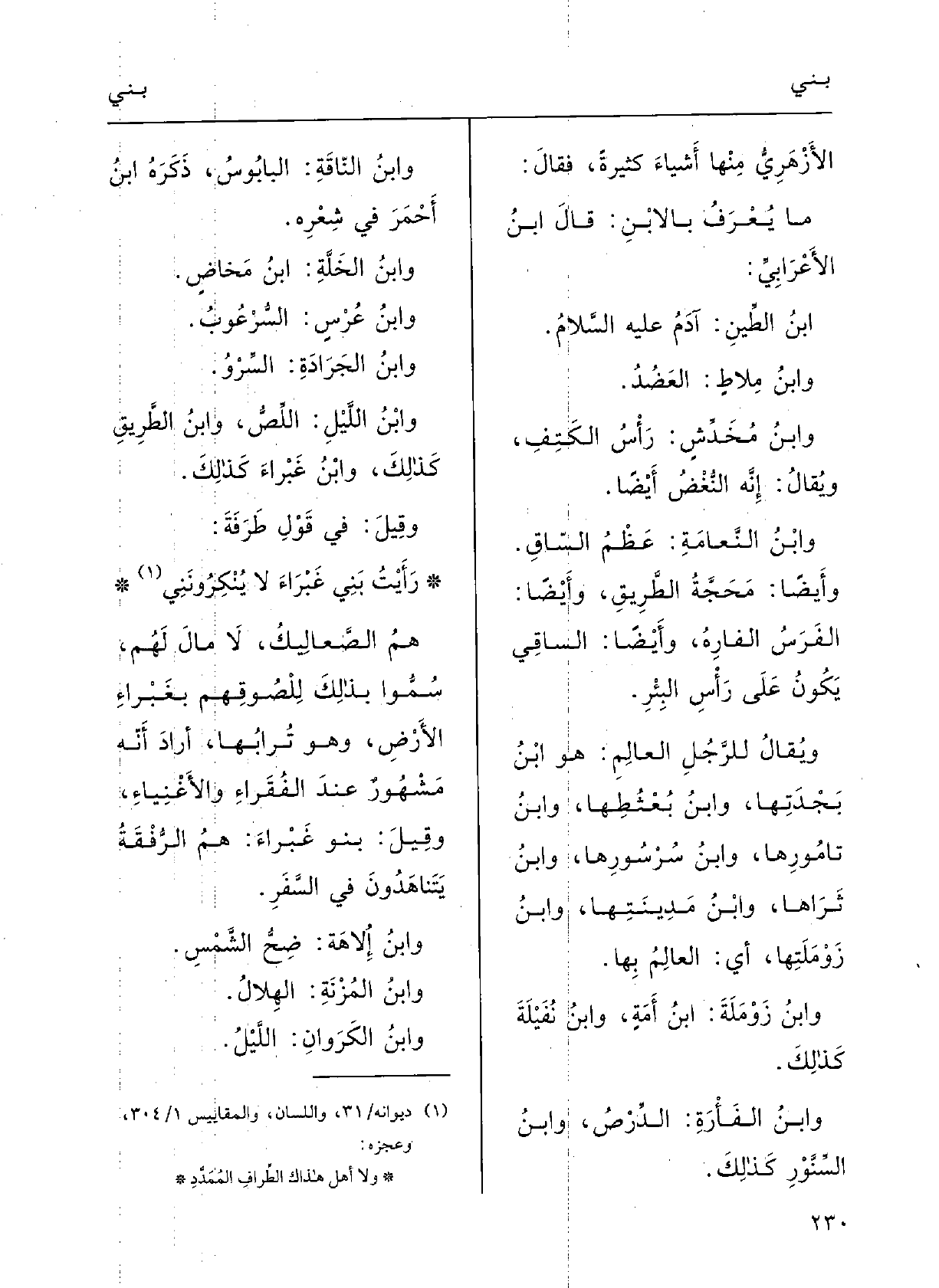 الأزْهرِيُّ مِنْهَا أَشْياءَ كَثيرَةً فقالَ: مَا يُعْرَف {بالابنِ: قالَ ابنُ الأعْرابيِّ: ابْنُ الطِّينِ آدَمُ، عَلَيْهِ السَّلَام،} وابنُ مِلاطٍ: العَضُدُ.
