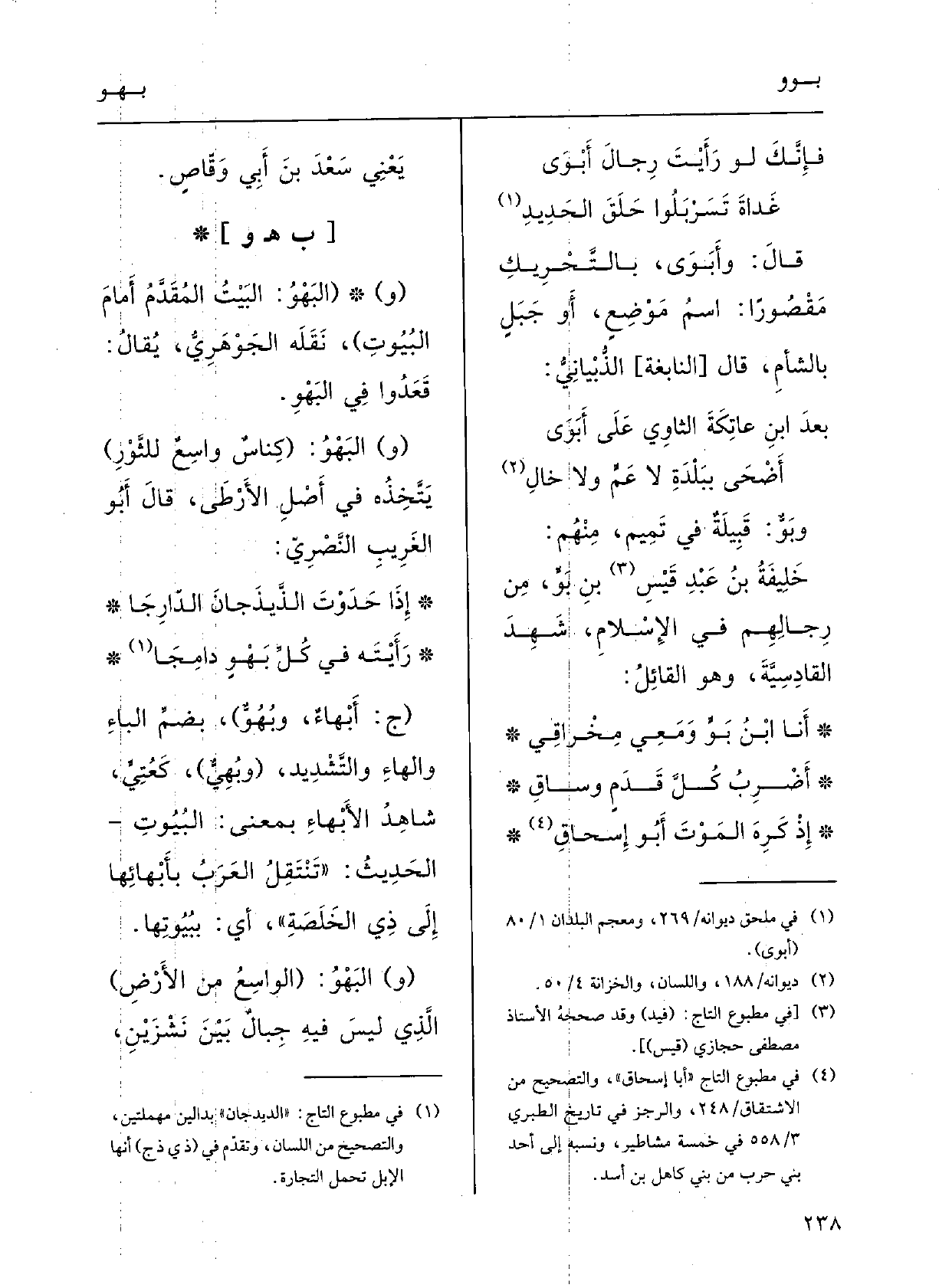 شاهِدُ} الأَبْهاءِ بمعْنَى البُيوتِ الحديِثُ: تَنْتَقِلُ العَرَبُ! بأَبْهائِها إِلَى ذِي الخلَصَةِ، أَي ببيوتِها.