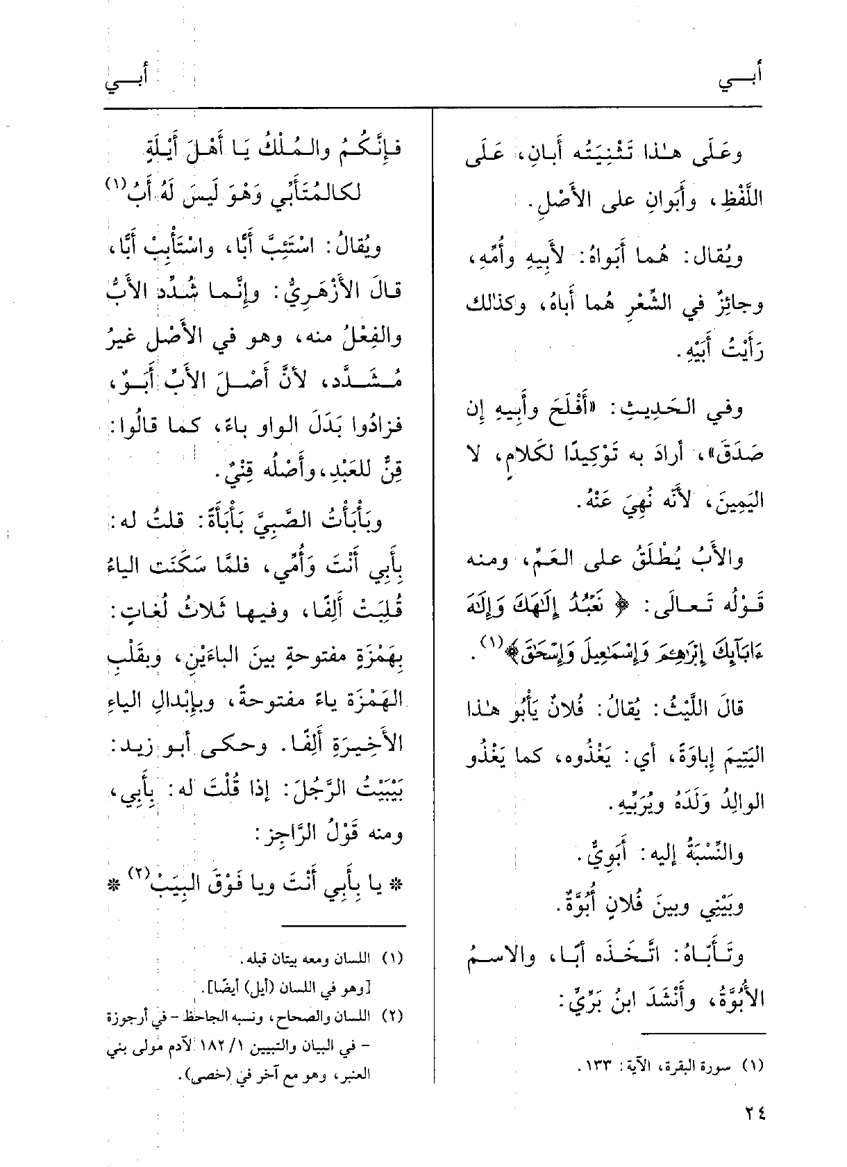 قالَ الأزْهرِيُّ: وإنَّما شُدِّد الأبُ والفعْلُ مِنْهُ، وَهُوَ فِي الأَصْل غيرُ مشدَّدٍ، لأنَّ أَصْلَ الأَبِ أَبَوٌ، فزَادَ وأَبدَلَ الواوَ بَاء كَمَا قَالُوا قِنٌّ للعَبْدِ، وأَصْلُه قِنْيٌ.