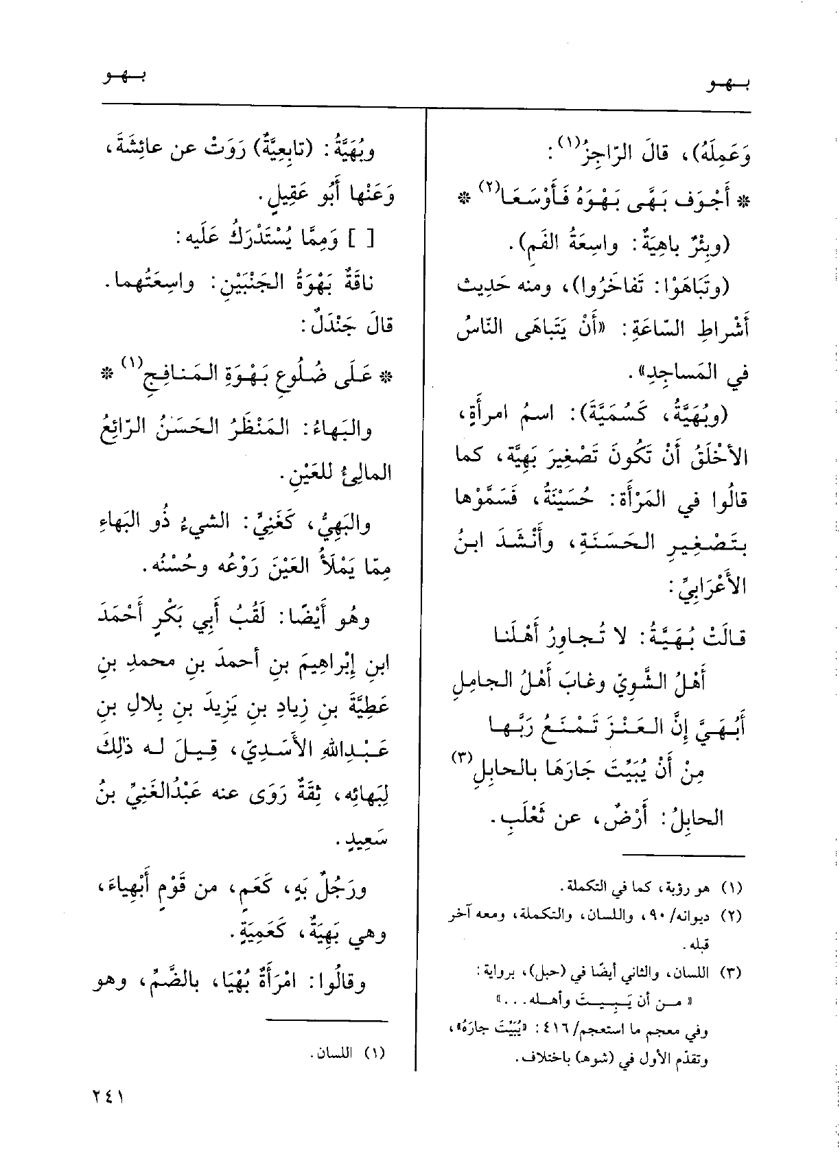 على ضُلُوع بَهْوَةِ المَنافِجِ} والبَهاءُ: المَنْظَرُ الحَسَنُ الرائِعُ المَالِىءُ للعَيْنِ.