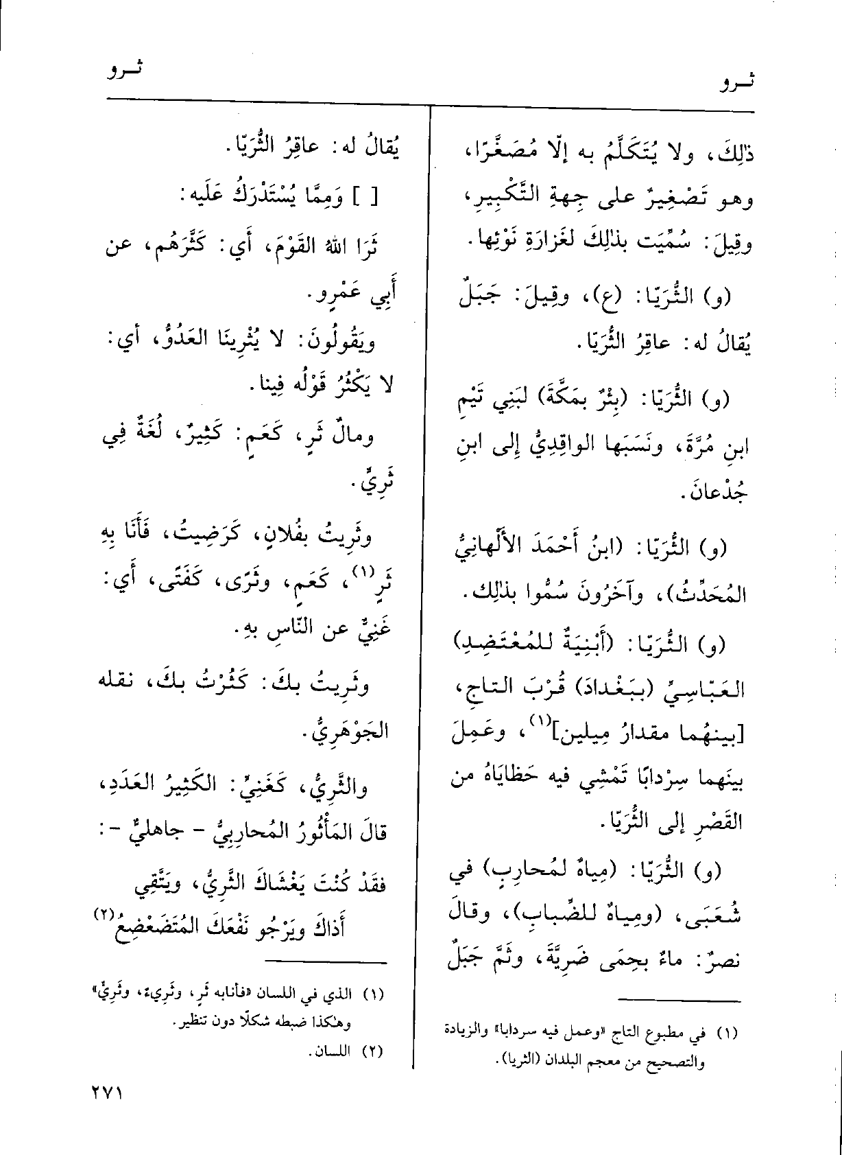 ومالٌ {ثَرٍ، كعَمٍ: كَثيرٌ، لُغَةٌ فِي} ثَرِي.