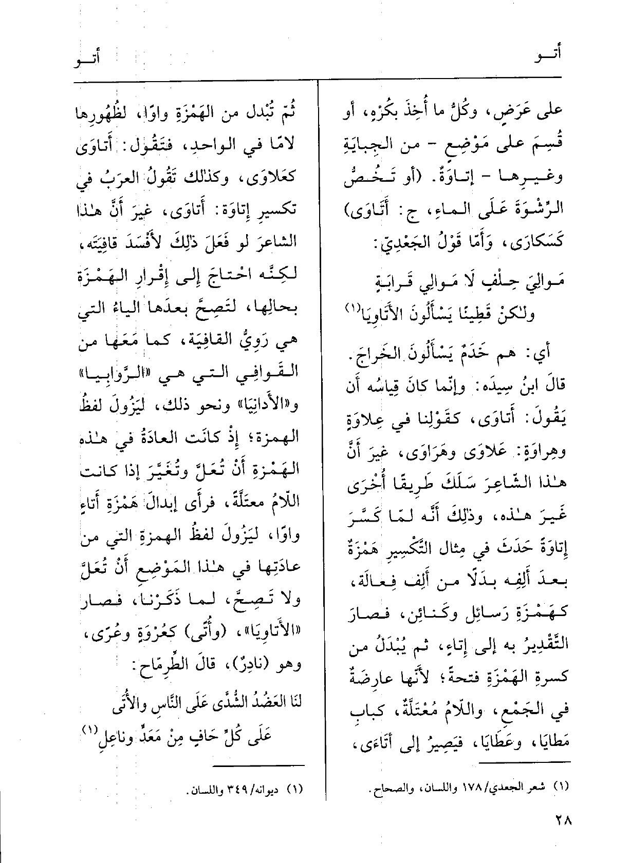 قالَ ابنُ سِيدَه: وإنَّما كانَ قِياسُه أَن يقولَ أَتاوَى كقَوْلِنا فِي عِلاوةٍ وهِراوَةٍ عَلاوَى وهَراوَى، غَيْر أَنَّ هَذَا الشاعِرَ سَلَكَ طَريقاً أُخْرَى غَيْر هَذِه، وَذَلِكَ أنَّه لمَّا كسَّرَ إتاوَةً حدثَ فِي مثالِ التَّكْسيرِ هَمْزةٌ بَعْد أَلِفِه بَدَلاً مِن أَلِفِ فِعالةٍ كهَمْزةِ وَسائِل وَكَنائِن، فصارَ التَّقْديرُ بِهِ إِلَى إتاءٍ، ثمَّ يبدلُ مِن كَسْرَةِ الهَمْزةِ فَتْحة لأنَّها عارِضَةٌ فِي الجَمْعِ، واللاّم مُعْتلَّة كبابِ مَطَايا وعَطَايا فيَصِيرُ إِلَى {أَتاءَى، ثمَّ تُبْدِل من الهَمْزةِ واواً لظُهورِها لاماً فِي الواحِدِ فتقولُ أَتاوَى كعَلاوَى، وكَذلِكَ تقولُ العَرَبُ فِي تكْسيرِ إتاوَةٍ أَتاوَى، غَيْر أَنَّ هَذَا الشاعِرَ لَو فَعَلَ ذلِكَ لأَفْسَدَ قافِيَته، لكنَّه احْتاجَ إِلَى إقْرارِ الهَمْزةِ بحالِها لتصِحَّ بَعْدها الياءُ الَّتِي هِيَ رَوِيُّ القافِيَةِ كَمَا مَعَها مِنَ القَوافِي الَّتِي هِيَ الرَّوابِيا والأَدانِيا ونَحْو ذلِكَ، ليَزُولَ لَفْظُ الهَمْزَةِ، إِذْ كانتِ العادَةُ فِي هَذِه الهَمْزةِ أَن تُعَلَّ وتُغَيَّر إِذا كانتِ اللاَّم مُعْتلَّة، فرأَى إبْدال هَمْزة إتاءٍ واواً ليَزولَ لفظُ الهَمْزةِ الَّتِي مِن عادَتِها فِي هَذَا المَوْضعِ أَنْ تُعَلَّ وَلَا تصحَّ لمَا ذَكَرْنا، فصارَ الأَتاوِيا.