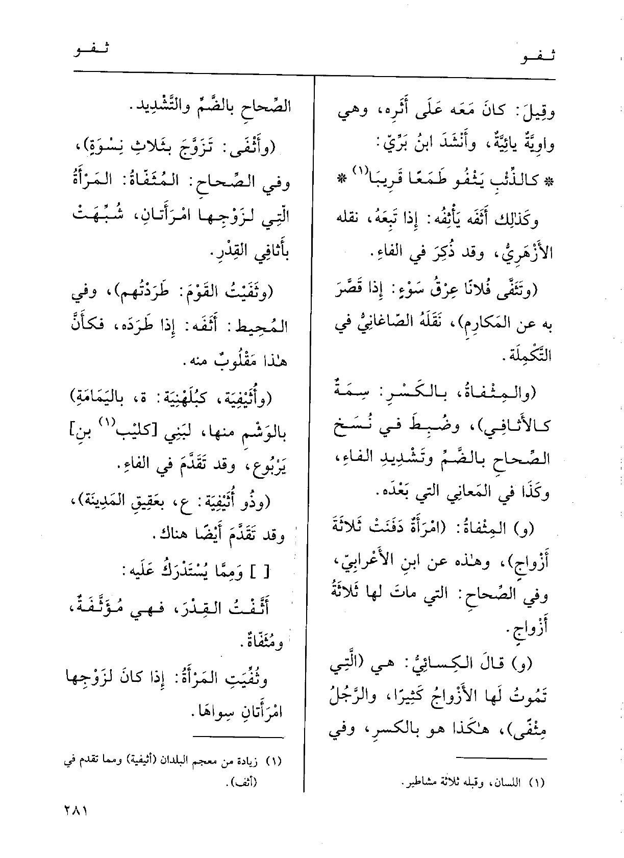 وَفِي الصِّحاحِ:} المُثَفَّاةُ: المرأَةُ الَّتِي لزَوْجِها امْرأَتانِ، شُبِّهت {بأَثافِي القِدْرَ.