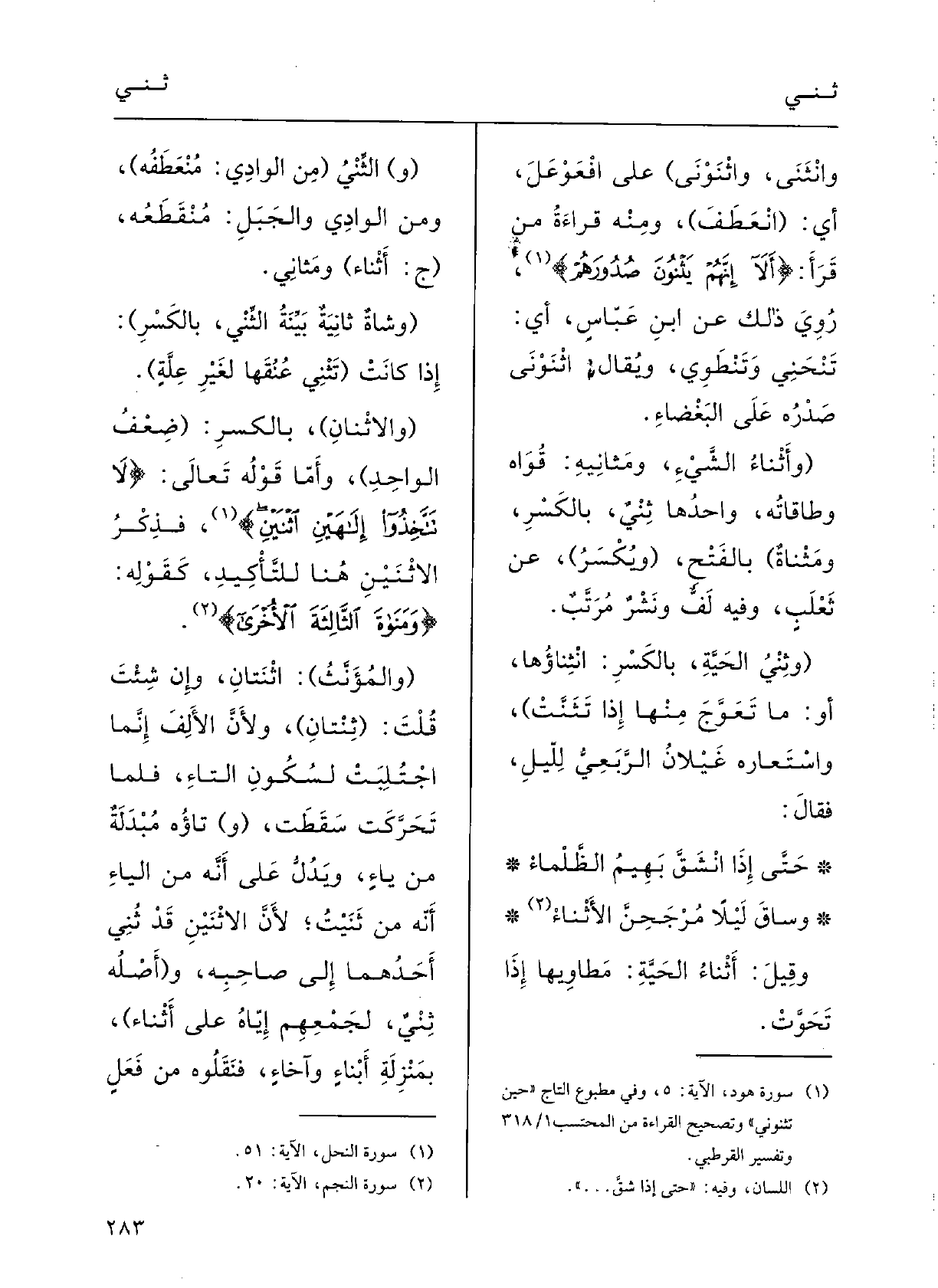 ( {والأَثْنانِ) ، بالكسْرِ: (ضِعْفُ الواحِدِ) ؛ وأَمَّا قَوْلُه تَعَالَى: {لَا تَتَّخِذُوا إلهَيْن} اثْنَيْن} ، فذَكَّر {الاثْنَيْن هُنَا للتَّأْكِيدِ كقَوْلِه: {ومَنَاة الثالِثَة الأُخْرى} ؛ (والمُؤَنَّثُ) } اثْنَتانِ، وَإِن شِئْتَ قُلْتَ: ( {ثِنتانِ) ولأنَّ الألِفَ إنَّما اجْتُلِبَتْ لسكونِ التاءِ فلمَّا تَحَرَّكتْ سَقَطَتْ، (و) تاؤُهُ مُبْدلَةٌ من ياءٍ، ويدلُّ على أنَّه مِن الياءِ أنَّه مِن} ثَنَيْتُ، لأنَّ الاثْنَيْن قد ثُنِي أَحَدُهما إِلَى صاحِبِه، (أَصْلُهُ ثِنْيٌ لجَمْعِهِم إيَّاهُ على أَثْناءٍ) بمنْزِلَة أَبْناءٍ وآخَاءٍ، فنَقَلُوه مِن فَعَلٍ