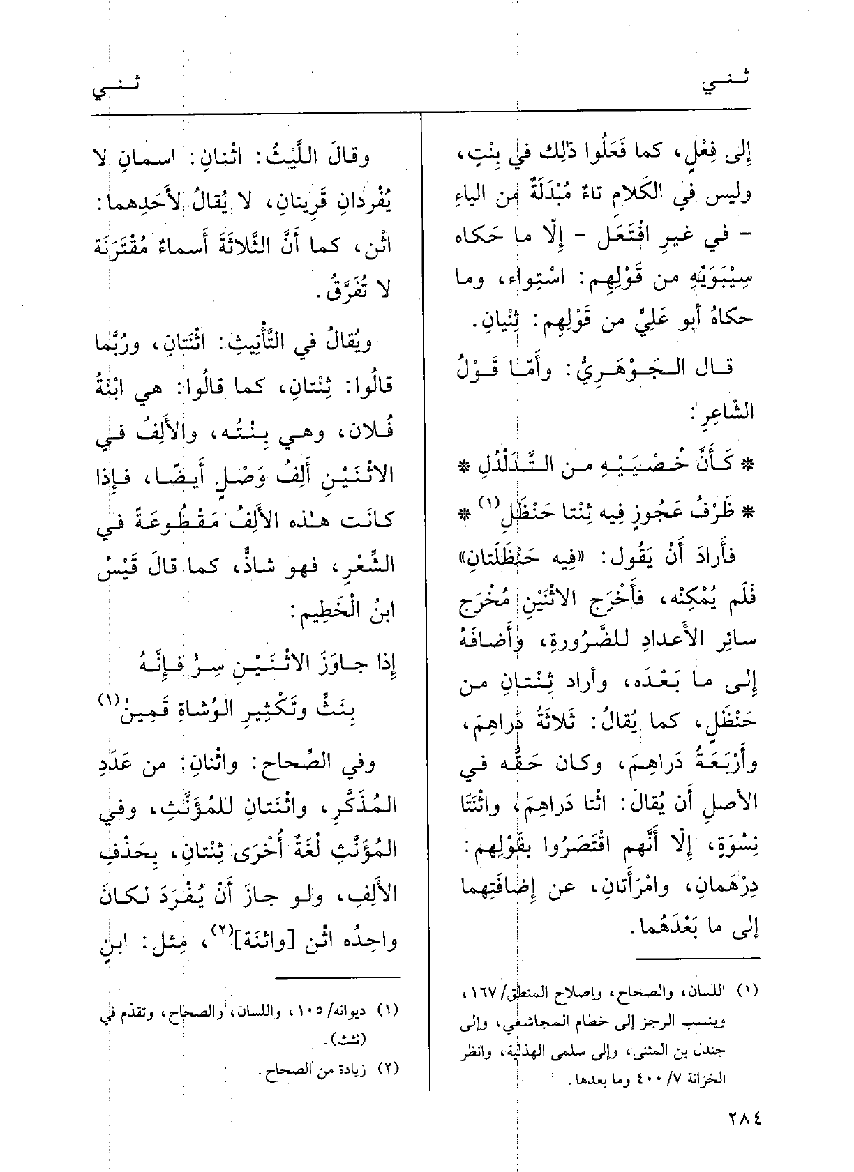 بنثَ وتكْثيرِ الوُشاةِ قَمِين ُوفي الصِّحاحِ،} واثْنانِ من عَدَدِ المُذَكَّر،! واثْنَتانِ للمُؤْنَّثِ، وَفِي المُؤَنَّثِ لُغَةٌ أُخْرى ثِنْتانِ بحذْفِ الألِفِ، وَلَو جازَ أَن يُفْرَدَ لكانَ واحِدُه اثْنٌ مِثْل ابْنِ