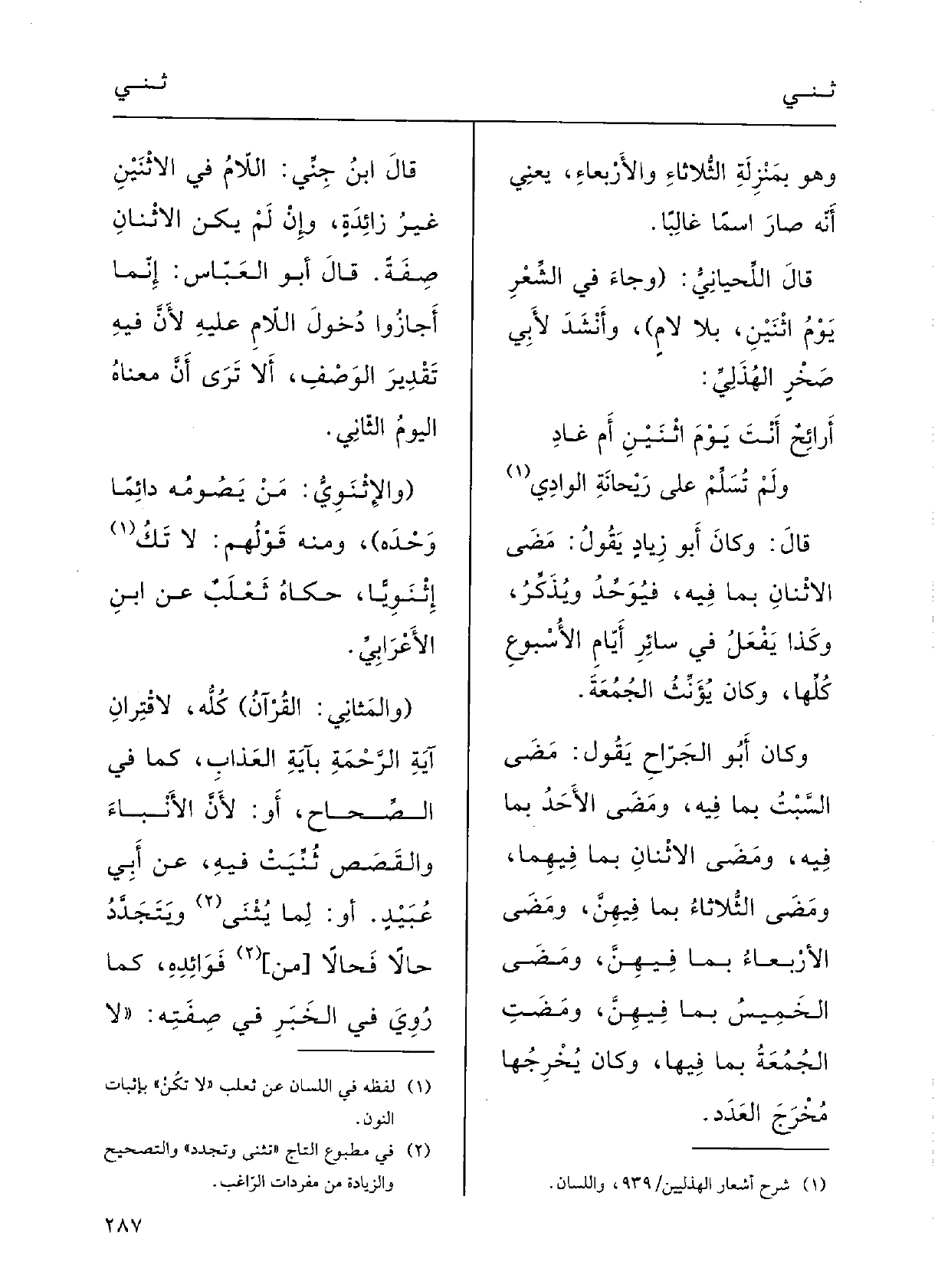 قالَ اللَّحْيانيُّ: (وجاءَ فِي الشِّعْرِ يَوْمُ اثْنَيْنِ، بِلا لامٍ) ، وأَنْشَدَ لأبي صَخْرٍ الهُذَليّ: