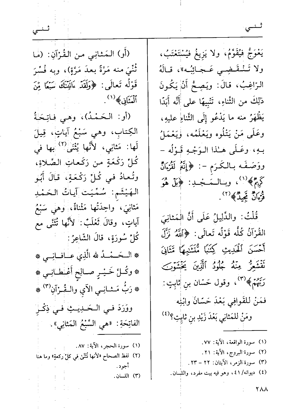 قُلْتُ: والدَّلِيلُ على أَنَّ {المَثاني القُرْآن كُلّه قَوْله تَعَالَى: {اللَّهُ نَزَّلَ أَحْسَن الحدِيثِ كتابا مُتَشابهاً} - مَثاني تَقْشَعرّ مِنْهُ} ؛ وقَوْلُ حَسَّان بن ثابتٍ: