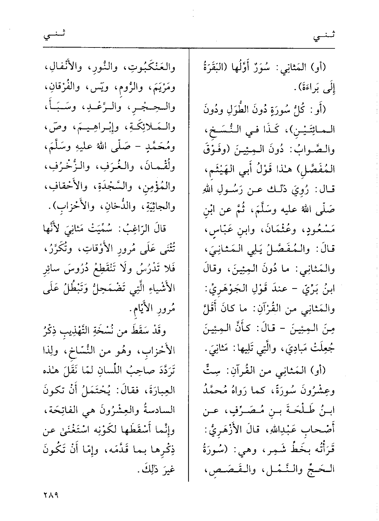 (أَو) المَثانِي مِن القُرآنِ: سِتٌّ وعِشْرُونَ سُورَة، كَمَا رَوَاهُ محمدُ بنُ طَلْحَةَ بنِ مُصَرِّف عَن أَصْحابِ عبدِ اللَّهِ؛ قالَ الأَزْهرِيُّ: قَرَأْته بخطِّ شَمِرٍ؛ وَهِي: (سُورَةُ الحَجِّ، والنَّملِ، والقَصَصِ، والعَنْكَبُوتِ، والنُّورِ، والأَنْفالِ، ومَرْيَمَ، والرُّومِ، ويسلله، والفُرْقانِ، والحجْرِ، والرَّعْدِ، وسَبَأَ، والملائِكَةِ، وإبراهيمَ، وصلله، ومحمدٍ صلى الله عَلَيْهِ وَسلم ولُقْمانَ، والغُرَفِ، والزُّخْرُفِ، والمُؤْمِنِ، والسَّجْدَةِ، والأَحْقافِ، والجاثِيَةِ، والدُّخانِ، والأَحْزابِ) .