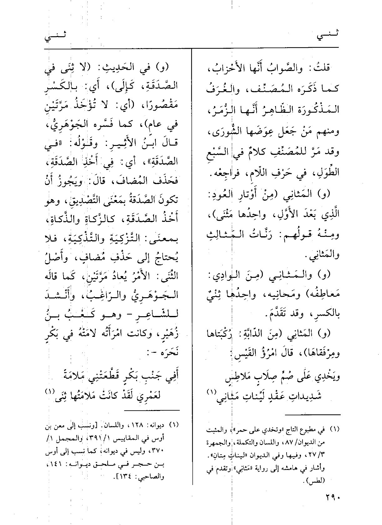 وأَصْلُ! الثِّنَى: الأَمْرُ يُعادُ مَرَّتَيْن؛ كَمَا قالَهُ الجَوْهرِيُّ والرَّاغبُ. وأَنْشَدَا للشاعِرِ، وَهُوَ كَعْبُ بنُ زهيرٍ، وكانتِ امْرأَتُه لامَتْه فِي بكرٍ نَحَرَه: