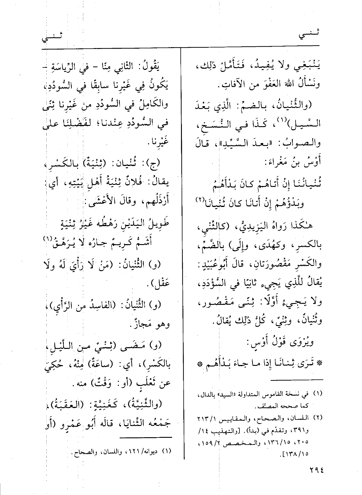 قالَ أَبو عبيدٍ: يقالُ للَّذي يَجيءُ {ثانِياً فِي السُّوددَ وَلَا يَجِيءُ أَولاً ثُنىً، مَقْصورٌ،} وثُنْيانٌ {وثِنْيٌ، كلُّ ذلِكَ يقالُ؛ ويُرْوَى قَوْل أَوْس.