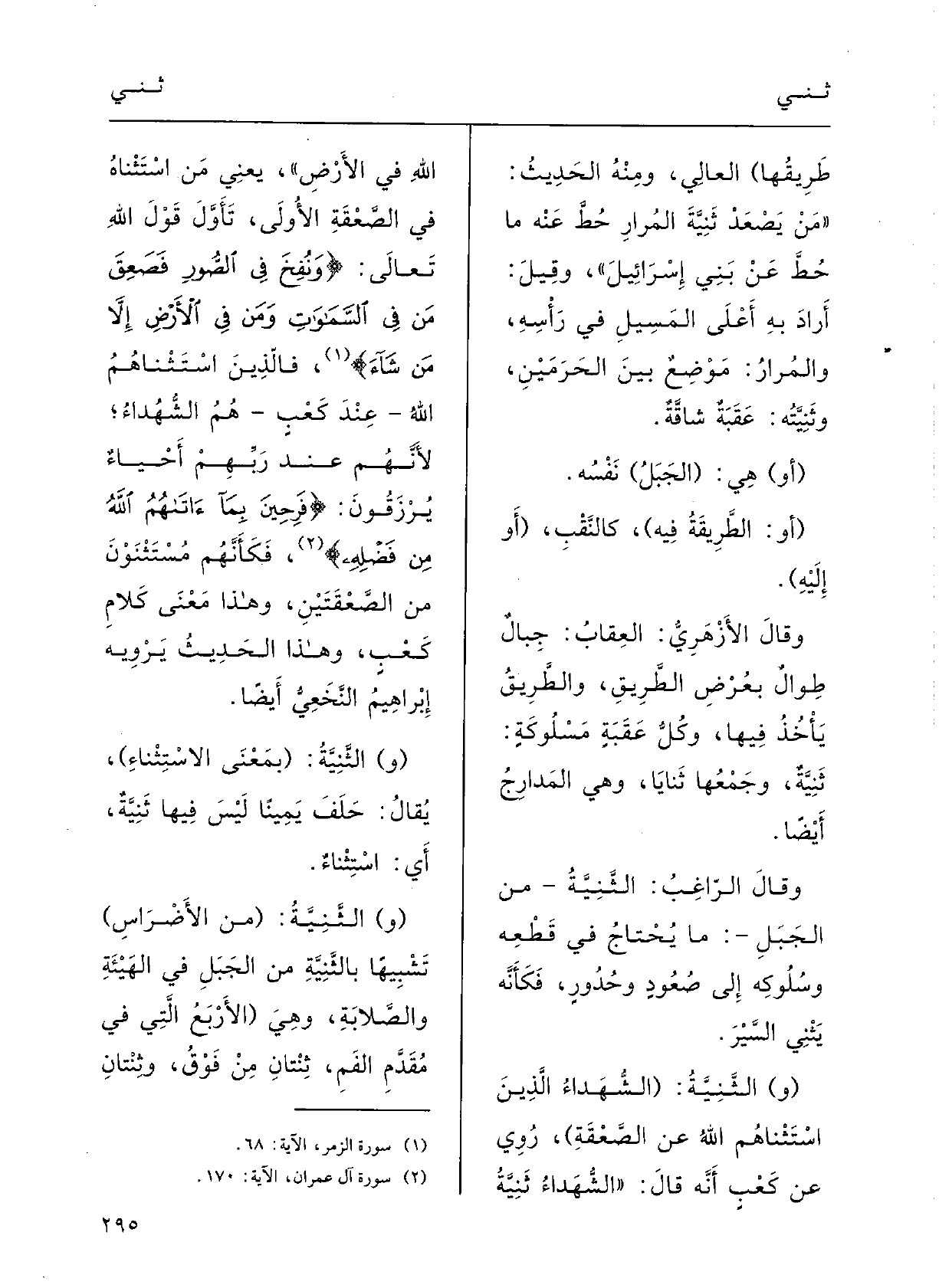 (و) الثَّنِيَّةُ: (الشُّهَداءُ الَّذين اسْتَثْناهُمُ اللَّهُ عَن الصَّعْقَةِ) ، رُوِي عَن كَعْب أَنه قالَ: الشُّهَداءُ {ثَنِيَّةُ اللَّهِ فِي الأرْضِ، يعْنِي مَنِ، اسْتَثْناهُ فِي الصَّعْقَةِ الأُولى، تَأَوَّل قَوْلَ اللَّهِ تَعَالَى: {ونُفِخَ فِي الصّورِ فصَعِقَ مَنْ فِي السَّماواتِ ومَنْ فِي الأرْضِ إلاَّ من شاءَ اللَّهُ} ؛ فَالَّذِينَ} اسْتَثْنَاهُمُ اللَّهُ عنْدَ كَعْب هُمُ الشُّهداءُ لأنَّهم عنْدَ رَبِّهم أَحْياءٌ يُرْزَقونَ فَرِحِين بمَا آتاهُمُ اللَّهُ من فضْلِه، فكأنَّهم {مُسْتَثْنَونَ من الصعقتين وَهَذَا معنى كَلَام كَعْب وَهَذَا الحَدِيث يرويهِ إِبْرَاهِيم أَيْضا (و) الثَّنيَّةُ: (بِمَعْنى} الاسْتِثْناءِ) يقالُ حَلَفَ يَمِينا ليسَ فِيهَا ثَنِيَّة، أَي {اسْتِثْناء.