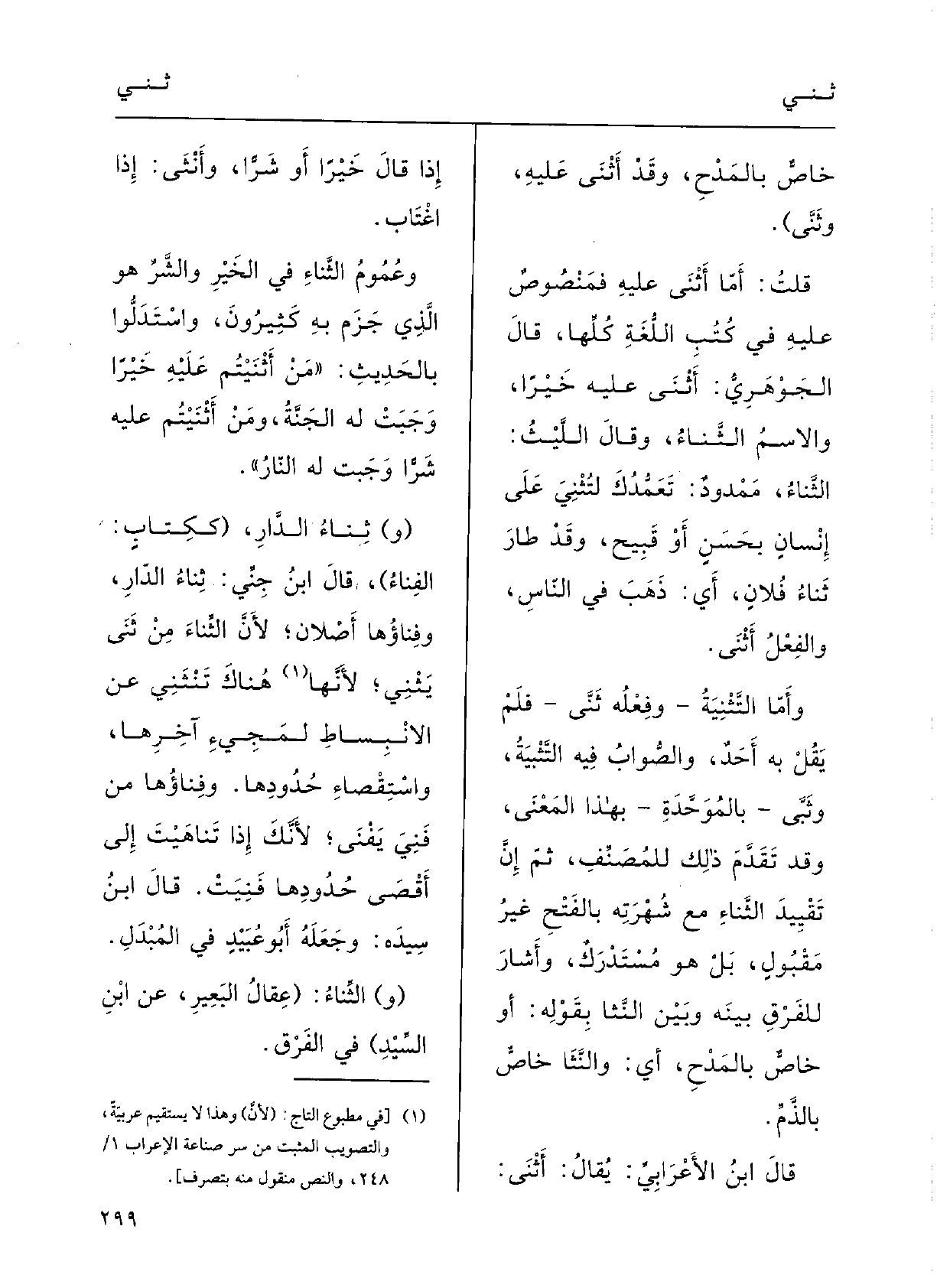 (قُلْتُ: أَمَّا أَثْنَى فمَنْصوصٌ عَلَيْهِ فِي كُتُبِ اللُّغَةِ كُلِّها.