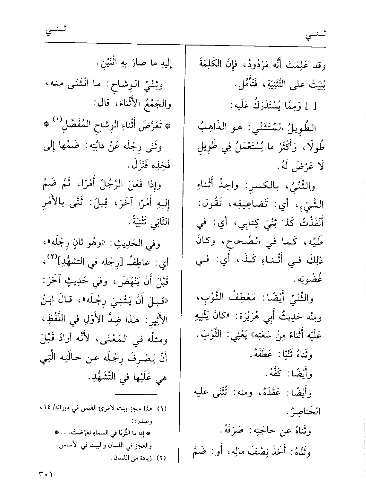 وَفِي حدِيثٍ آخَرَ: (قَبْلَ أنْ} يَثْنيَ رِجْلَه) ، قالَ ابنُ الأثيرِ: هَذَا ضِدّ الأوّل فِي اللفْظِ ومِثْله فِي المعْنَى، لأنَّه أَرادَ قَبْل أَن يصرفَ رِجْلَه عَن حالَتِه الَّتِي هِيَ عَلَيْهَا فِي التَّشهّدِ.