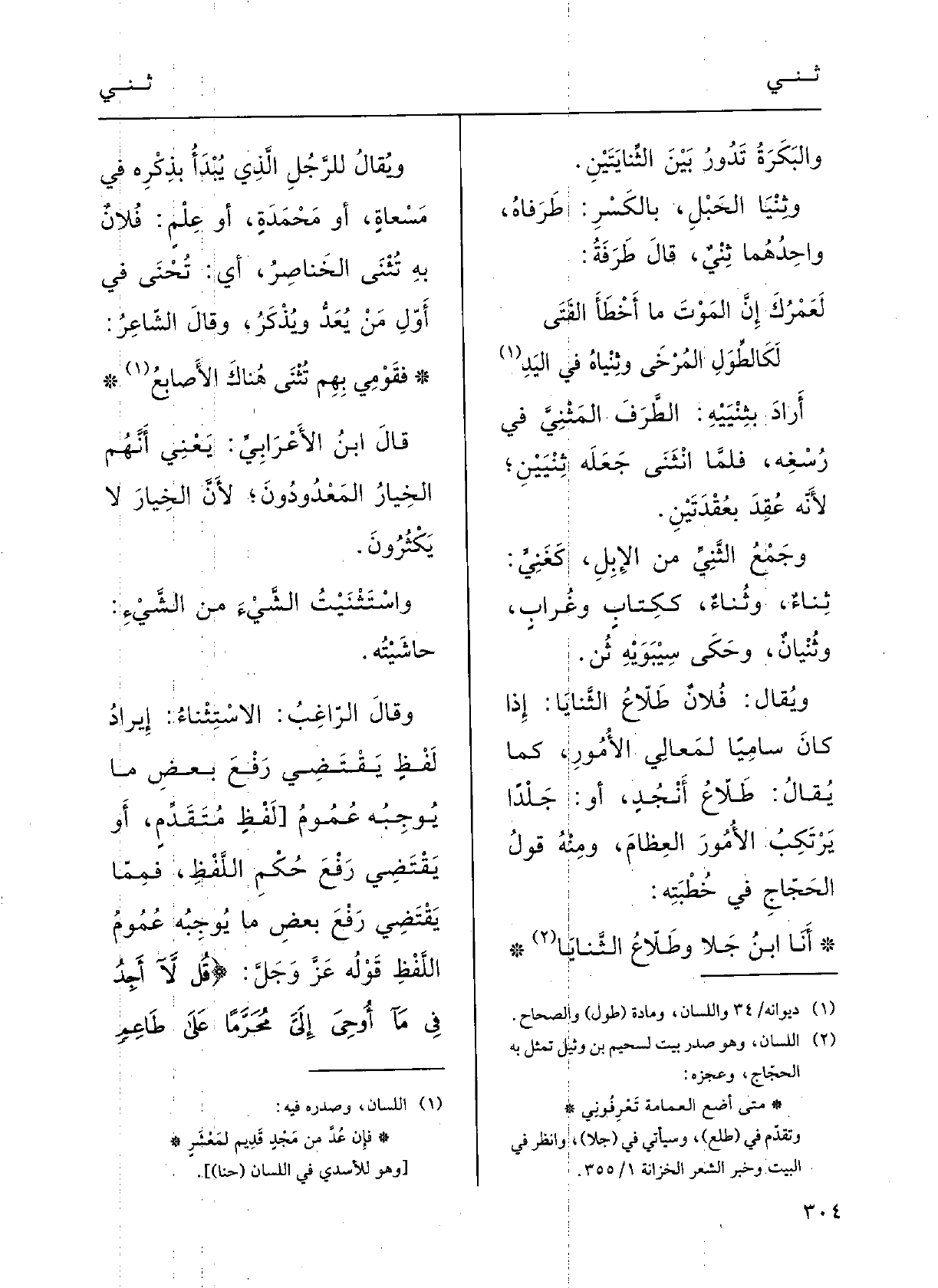 } وثِنْيا الحَبْل، بالكسْرِ: طَرَفاهُ، واحِدُهما {ثِنْيٌ؛ قالَ طرفَهُ: