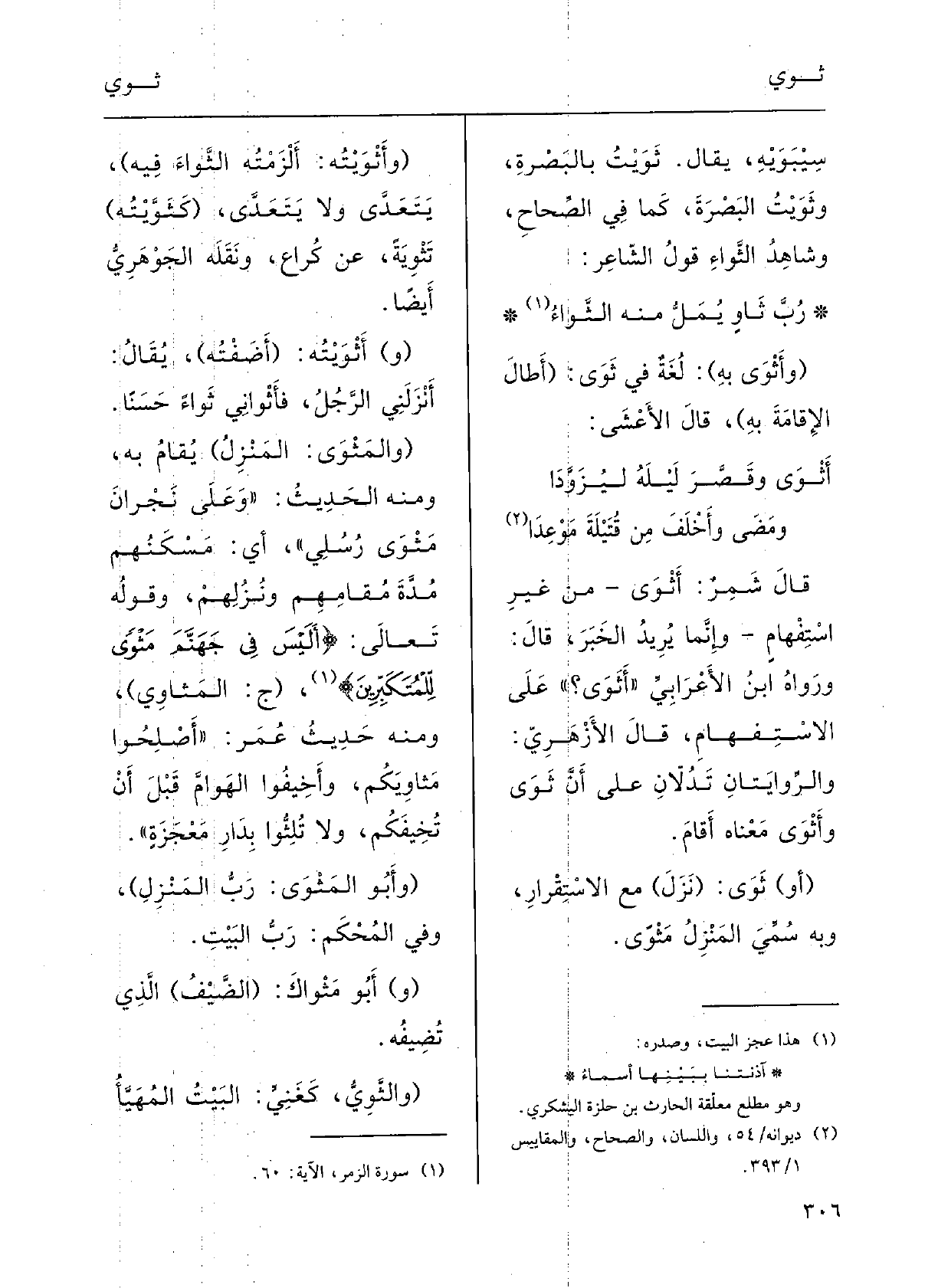 قالَ الأَزْهرِيُّ: والرِّوايَتَانِ تَدُلاّنِ على أنَّ ثَوَى وأَثْوَى مَعْناه أَقَامَ.